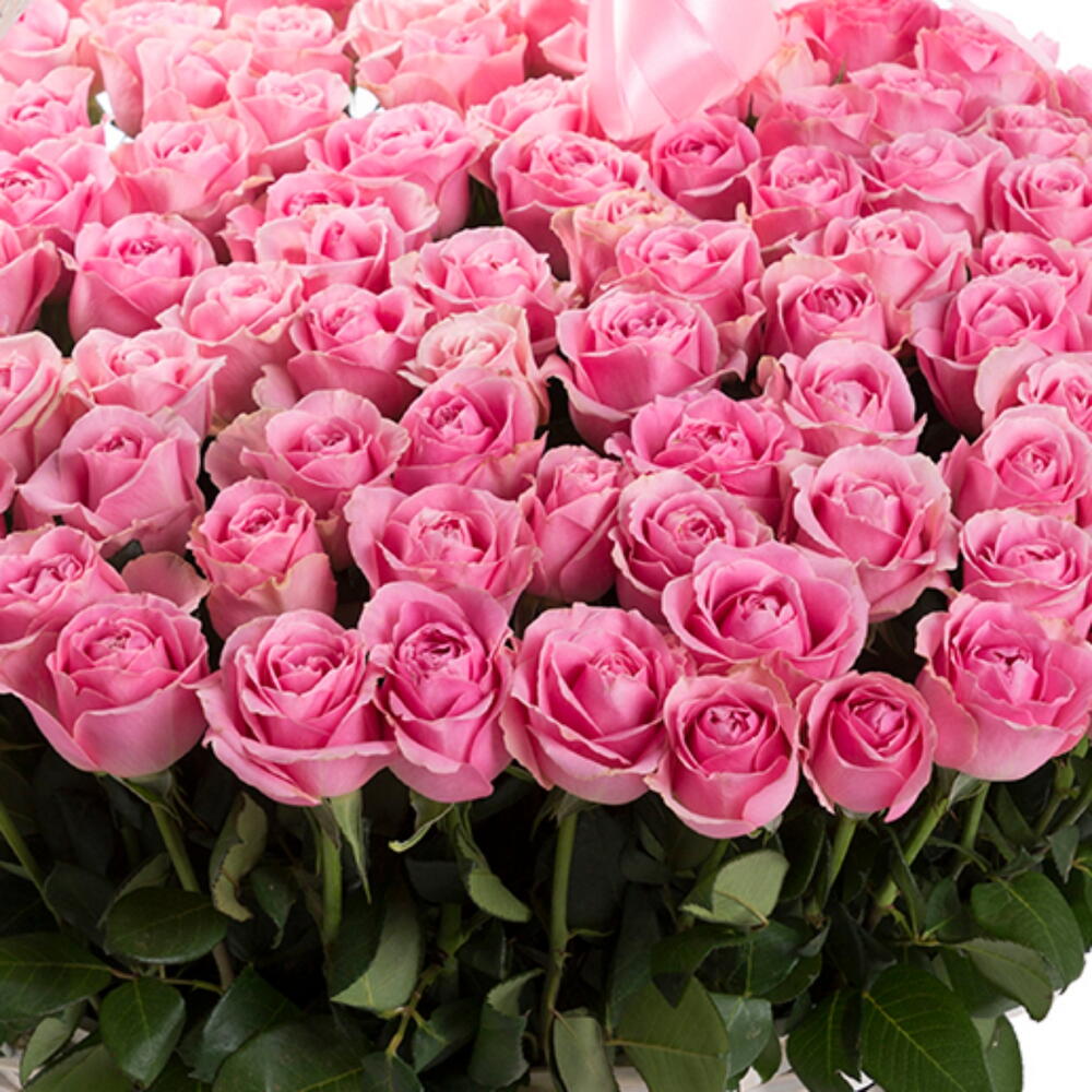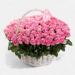 151pink roses présentées dans un panier en osier blanc. Détails de l'arrangement: Le panier est rempli à ras bord de nombreuses roses d'un rose vif et de feuillage vert. Un ruban de satin rose est noué sur le côté du panier