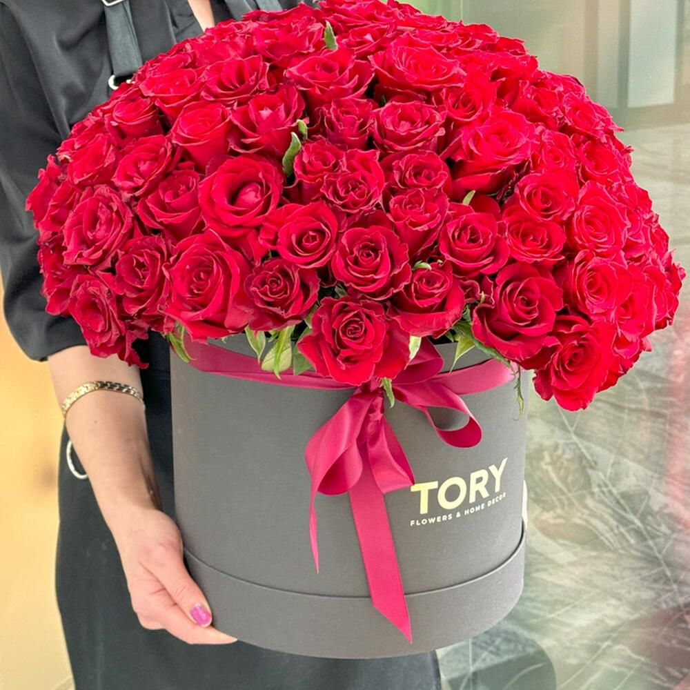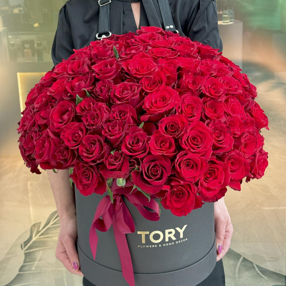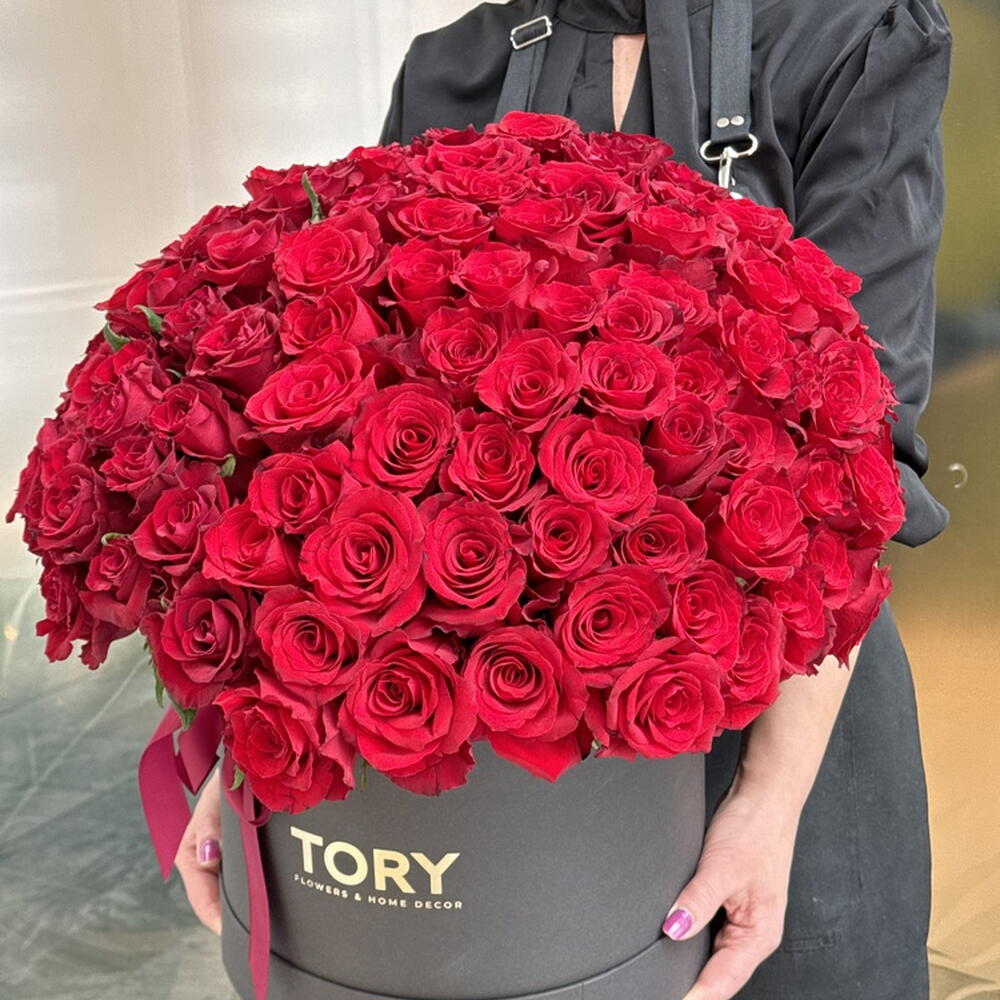 Composition: roses rouges - 151, boîte - 1 Dimensions: LARGEUR - 45CM; HAUTEUR - 55CM; LONGUEUR - 55CM; (y compris l'emballage) Taille: 45 x 55 x 55 cm