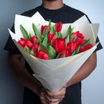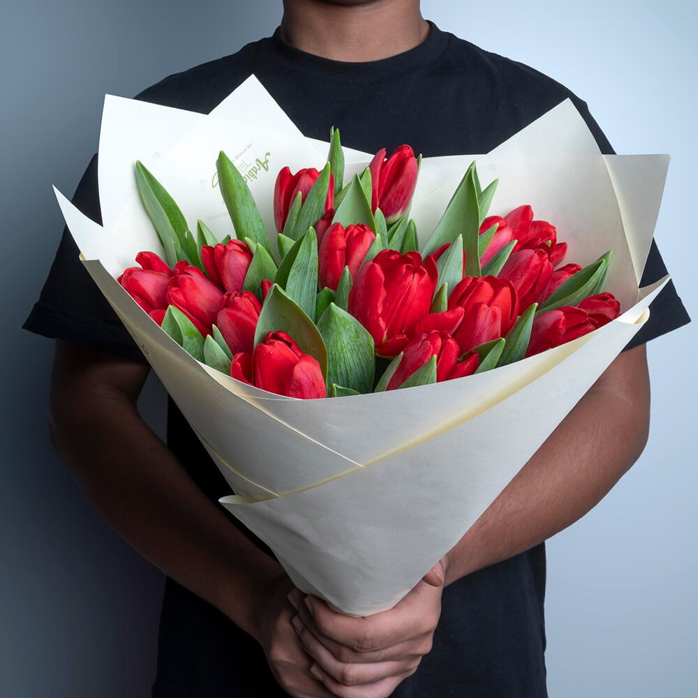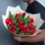 Bouquet de 19 tiges de tulipes, enveloppé dans un papier naturel et noué avec un ruban. Toutes les fleurs seront très fraîches et au stade de bouton ou semi-épanouies. Les fleurs s'épanouiront complètement par la suite si vous les laissez dans l'eau. Changez l'eau tous les jours et recoupez légèrement la base des tiges tous les deux jours.