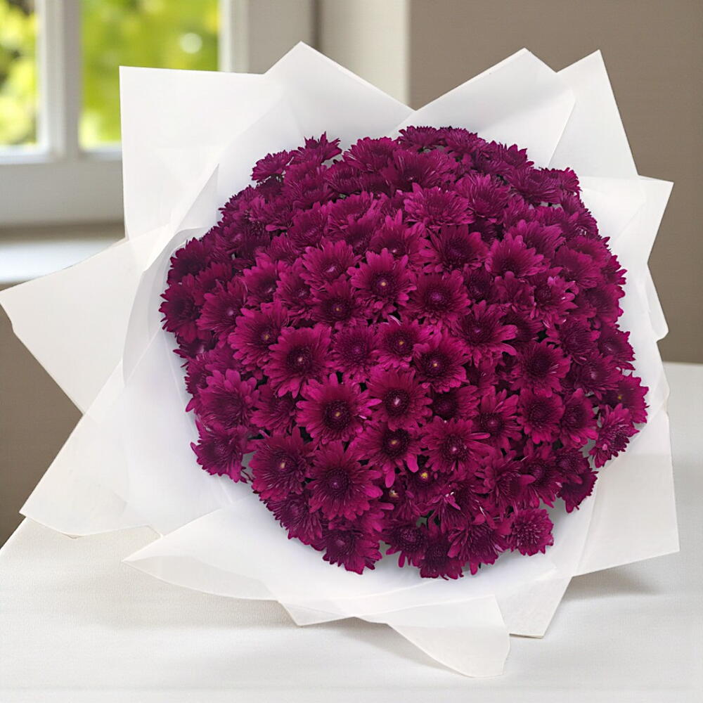 Des - Bouquet à la main de 19 chrysanthèmes violets en emballage blanc.