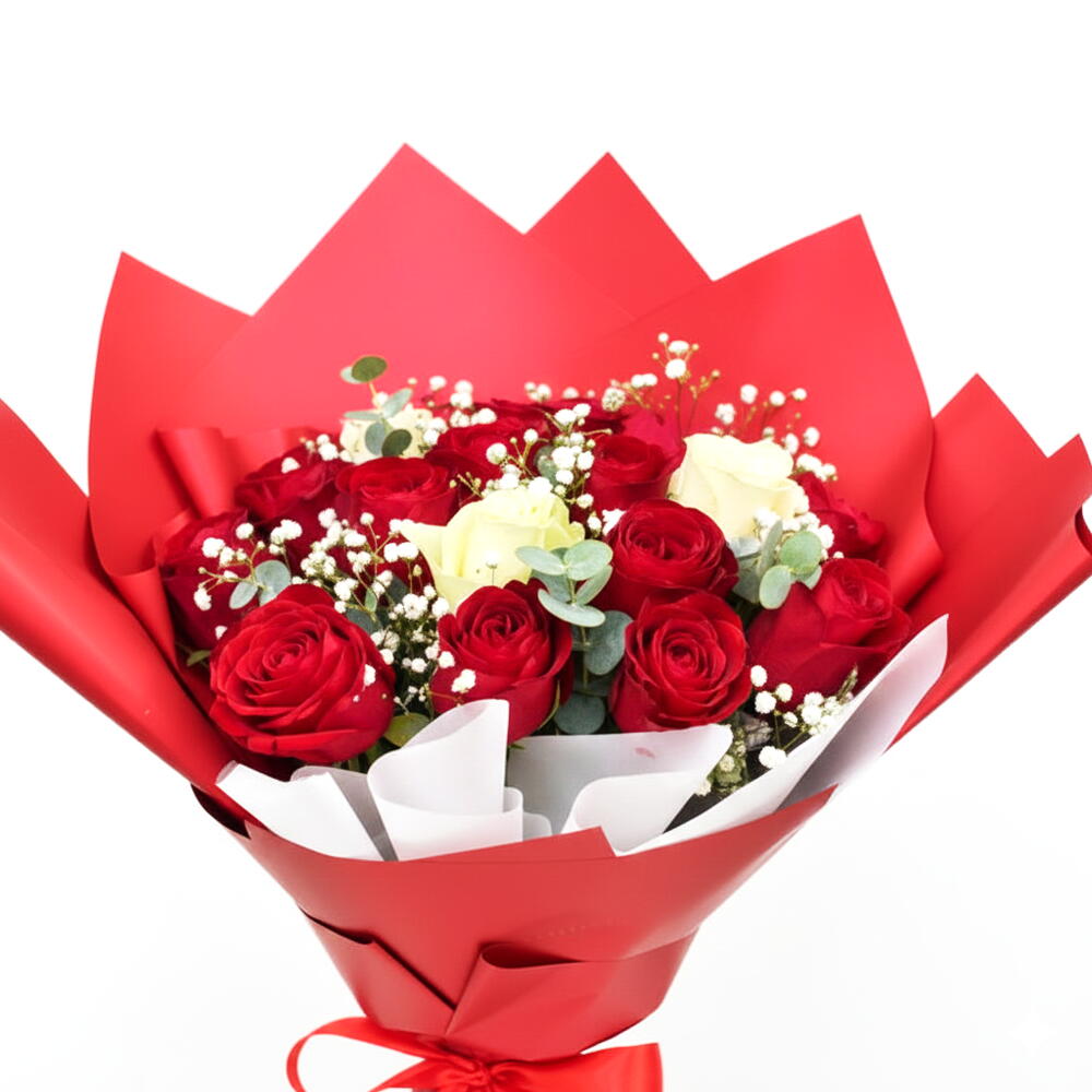 Red rose - 18 pce Ribbon - 1 pce White rose - 3 pce Gypsophila - 3 pce Wrapping - 5 pce