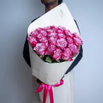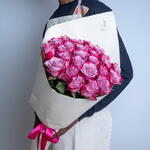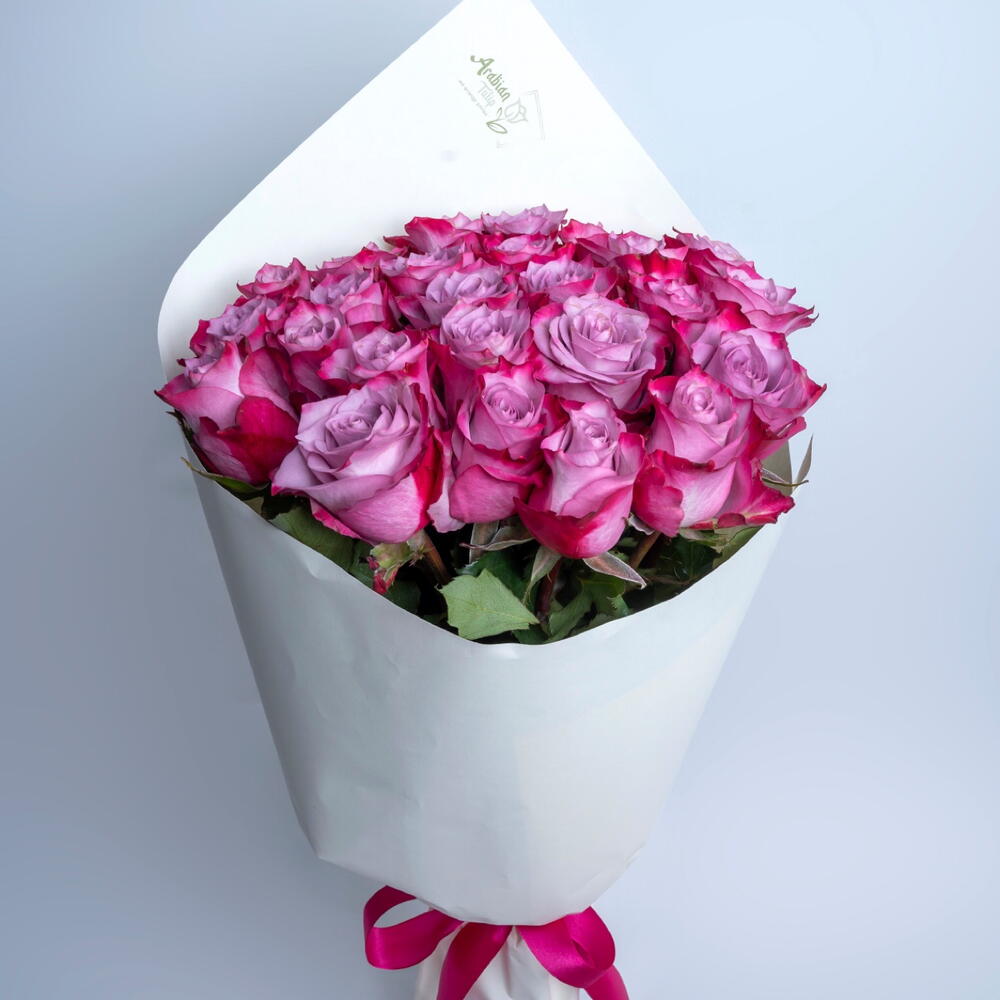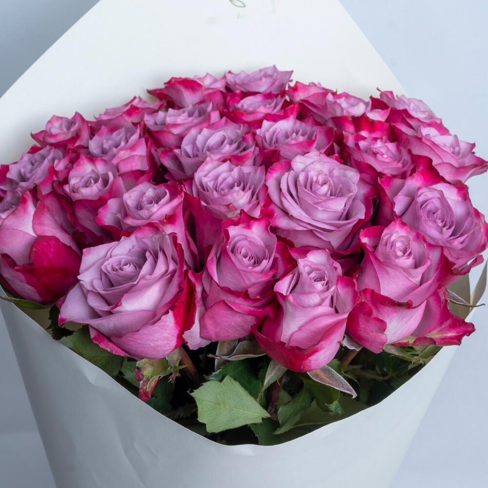 Bouquet de 25 tiges de roses violettes avec un papier d'emballage naturel et noué d'un ruban violet. Toutes les fleurs seront très fraîches et en bouton ou semi-épanouies. Les fleurs s'épanouiront complètement plus tard si vous les gardez dans l'eau. Changez l'eau tous les jours et recoupez légèrement le bas des tiges tous les deux jours