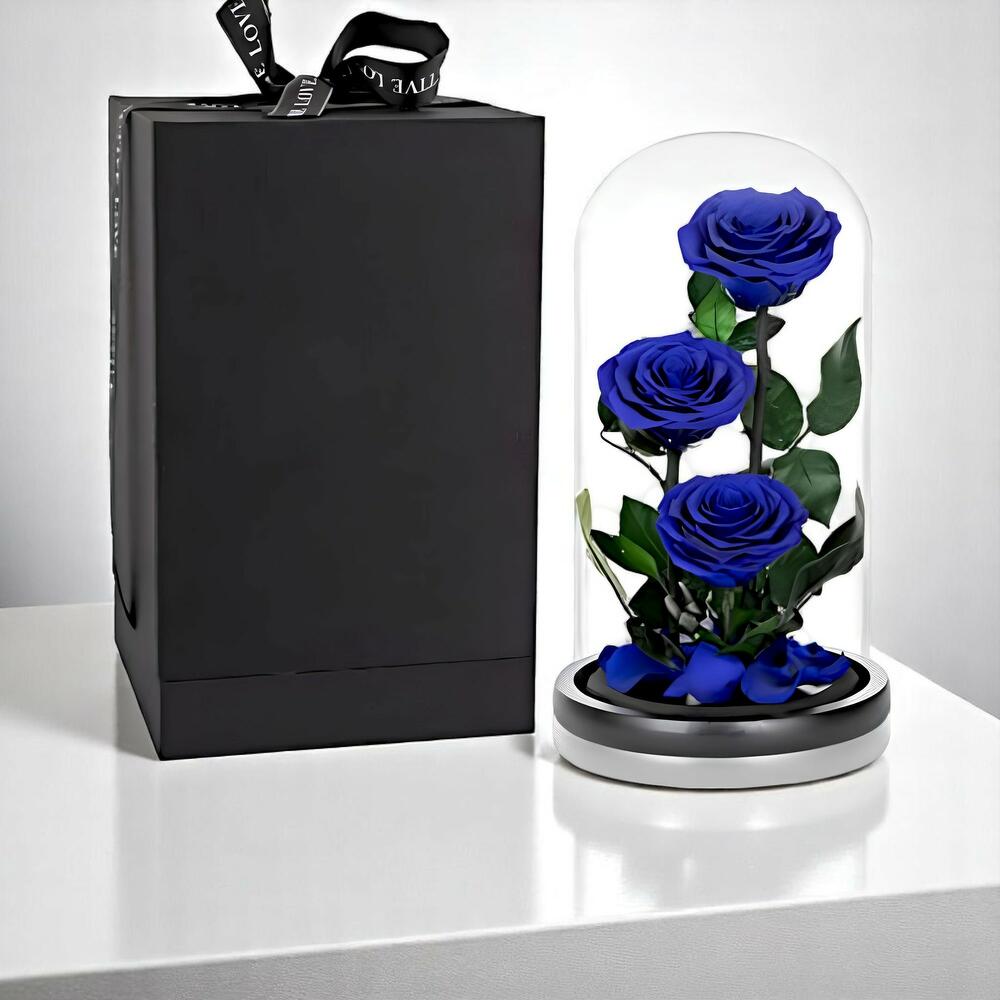 Box - 1 pce cloche en verre avec socle - 1 pce rose bleue éternelle - 3 pce