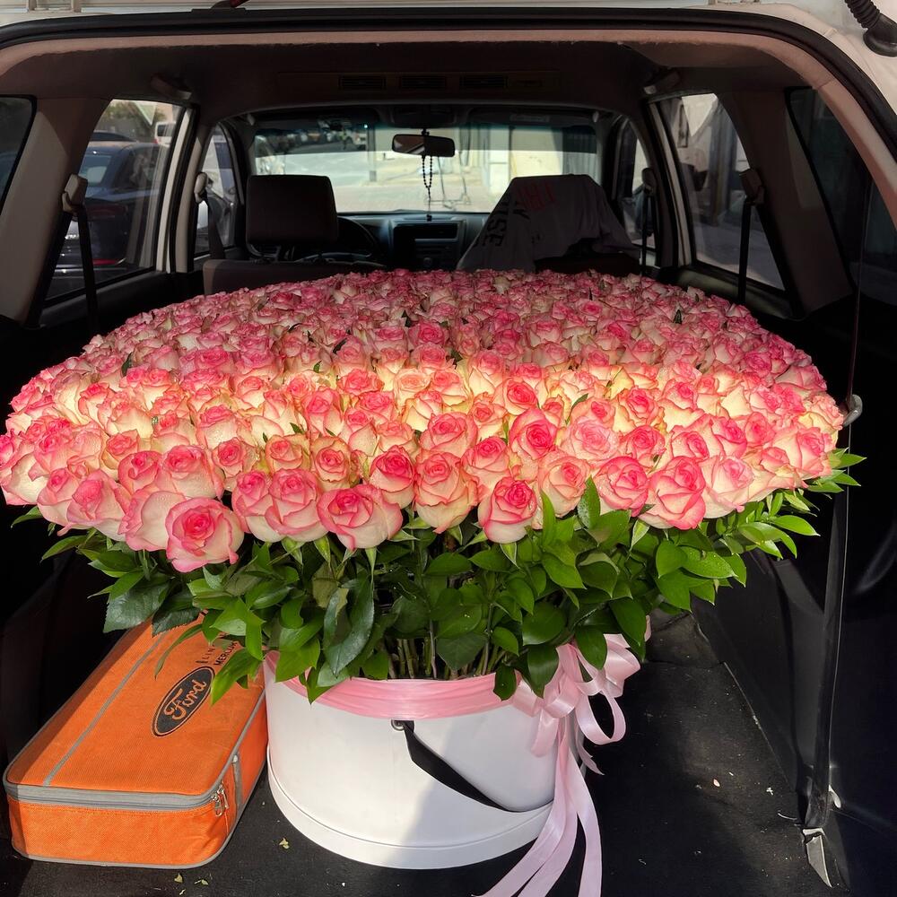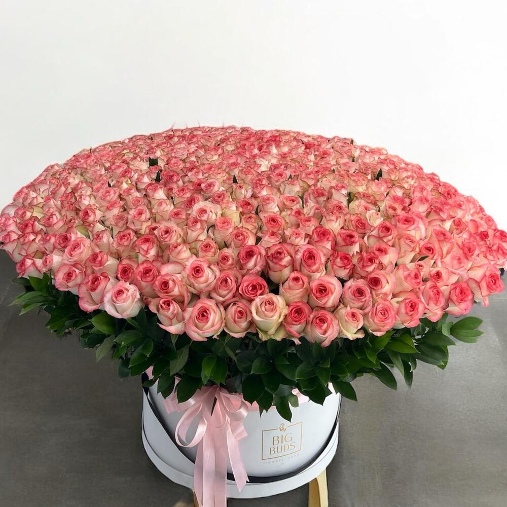 401 Coffret Premium de Roses🌸 Il s'agit d'un grand bouquet luxueux de roses de couleur rose, magnifiquement arrangé dans un contenant rond de type boîte à chapeaux. Les roses sont serrées les unes contre les autres, formant une silhouette en dôme luxuriante. Le contenant est blanc, avec un ruban rose pâle noué autour, lui donnant un aspect élégant et romantique.