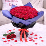 Des - Magnifique bouquet touchant le cœur de 35 roses rouges dans un emballage en forme de cœur bleu et un emballage noir uni noué d'un nœud de ruban rouge.