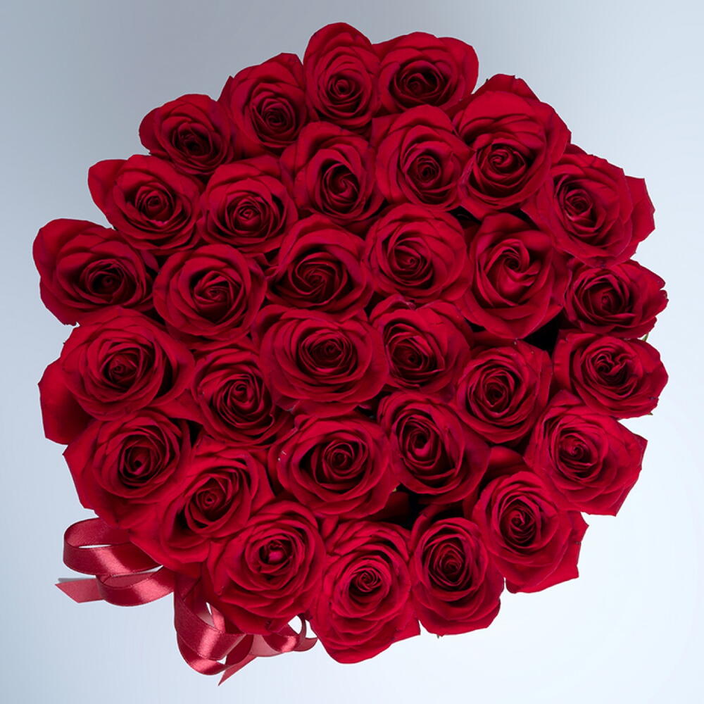 30 à 35 roses rouges disposées dans une boîte noire avec un ruban rouge