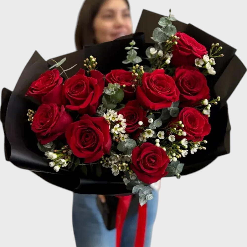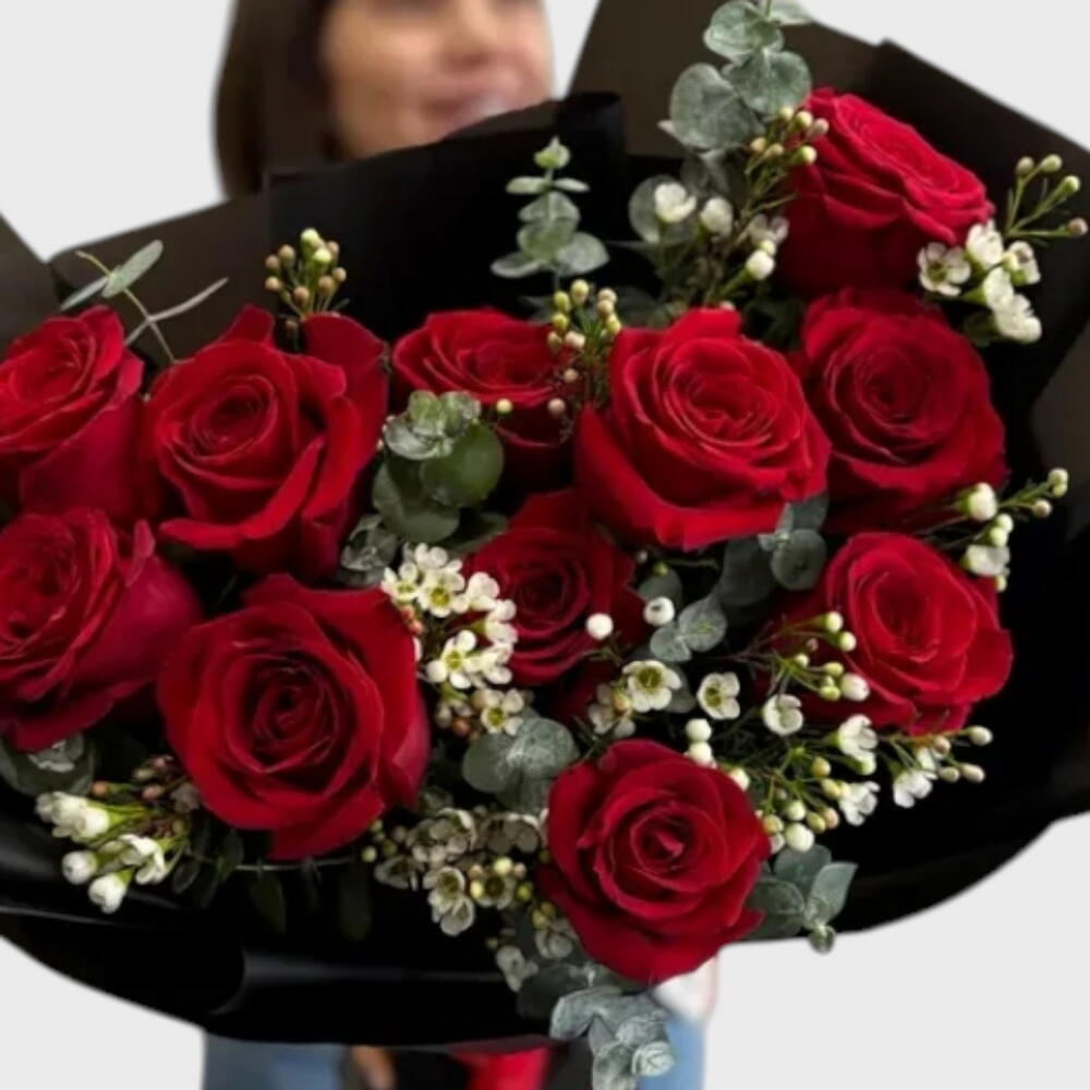 baby breath - 7 pce eucalyptus leaves - 11 pce red roses - 35 pce