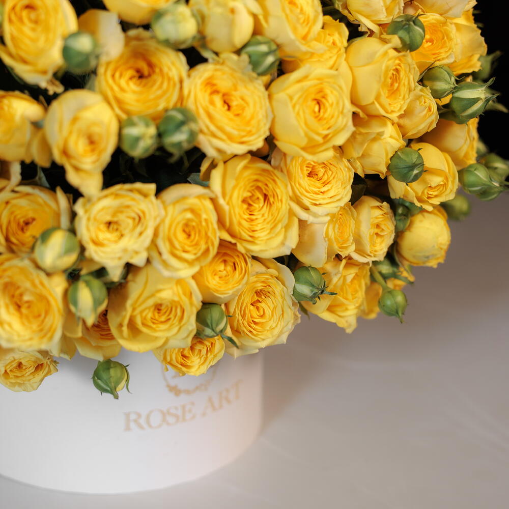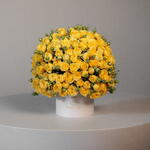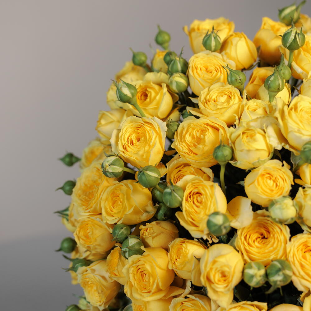 Une composition en boîte gaie de roses spray Yellow Bubble en forme de dôme classique. Leurs grappes vibrantes illuminent n'importe quel espace, rayonnant de chaleur, de joie et d'une touche d'élégance, parfaites pour célébrer les moments heureux de la vie.