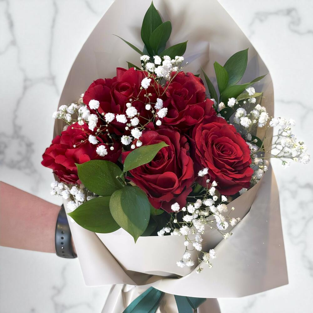 Red rose - 6 pce Ruscus - 3 pce gupsopila - 1 pce