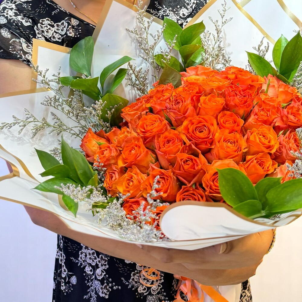 Éveillez la passion et la chaleur avec notre bouquet Sunset Blaze de 50 roses orange, une collection radieuse de 50 roses orange vibrantes, délicatement complétée par 5 fleurs de remplissage délicates et un feuillage vert luxuriant. Enveloppé dans un élégant papier blanc orné d'une bordure dorée, ce bouquet incarne l'énergie, l'enthousiasme et l'admiration — en faisant un cadeau audacieux mais gracieux pour tout moment spécial. Conseils d'entretien: Pour garder votre bouquet de roses orange frais et éclatant, placez les tiges dans un vase propre rempli d'eau fraîche et changez l'eau tous les deux jours. Conservez le bouquet dans un endroit frais et bien ventilé, à l'abri de la lumière directe du soleil et des courants d'air. Taillez les tiges en biais tous les quelques jours pour garantir une absorption optimale de l'eau.