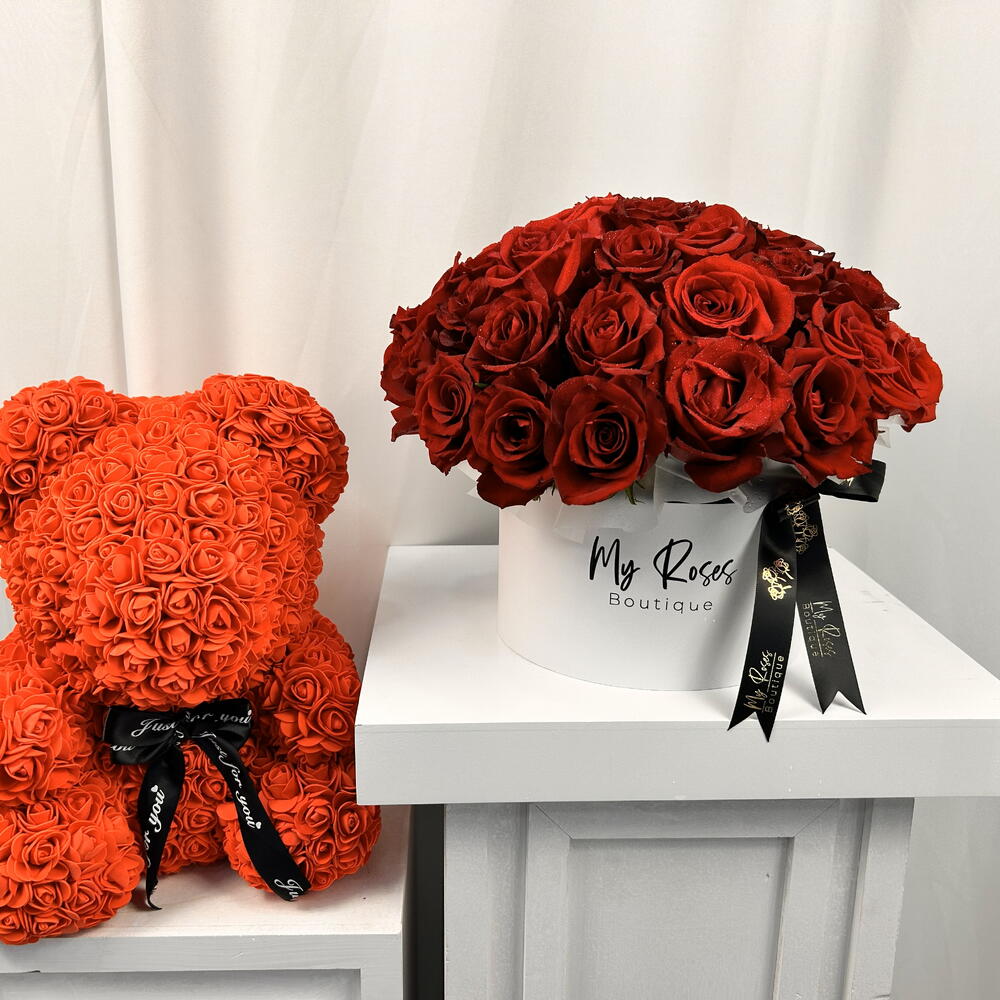 Découvrez une somptueuse composition de 50 roses rouges exquises, emballées avec passion dans une boîte charmante. Accompagnée d'un ours en peluche rouge de 40cm, cette composition est l'expression parfaite de l'amour et de l'affection. Elle vous offre la possibilité de partager un moment inoubliable avec votre être cher, transformant un jour ordinaire en une expérience magique. Surprenez et faites plaisir avec ce magnifique cadeau floral qui captive le cœur et l'âme par sa beauté et son charme.