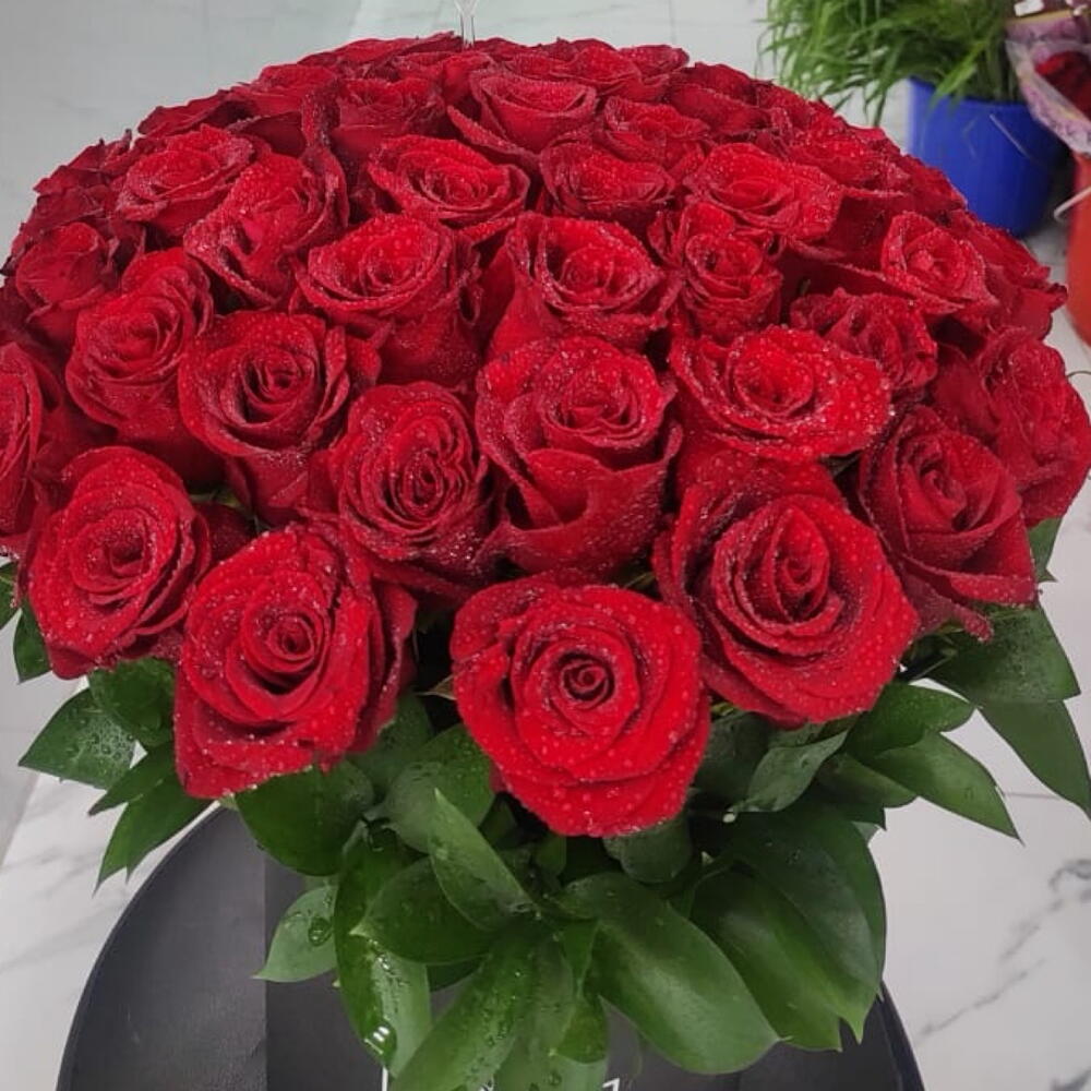 Arrangement en boîte de 50 roses rouges fraîches.
