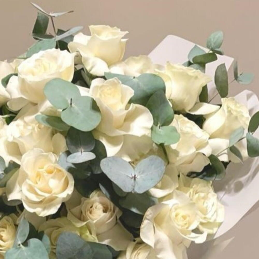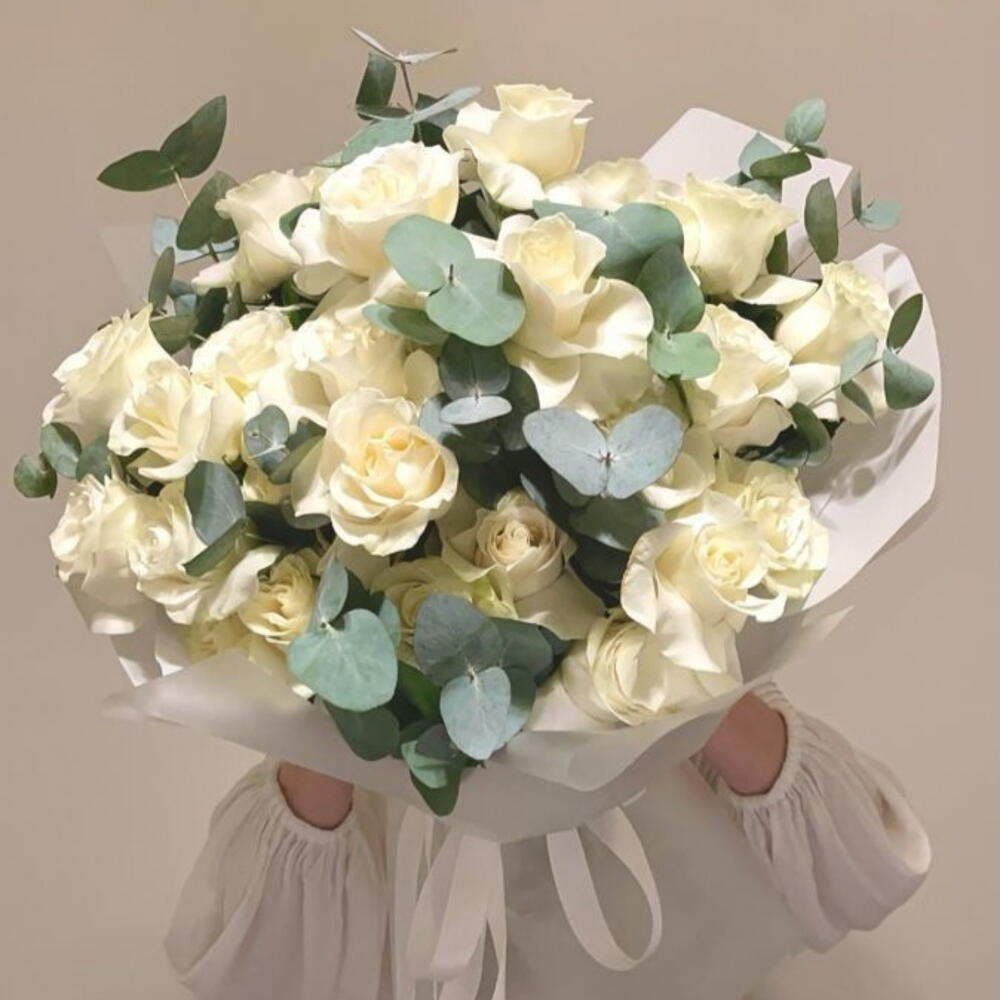Ribbon - 2 pce White rose - 51 pce carte postale - 1 pce eukalyptus - 10 pce krizal - 2 pce instruction - 1 pce boîte ou sac - 1 pce emballage - 2 pce boîte avec de l'eau - 1 pce