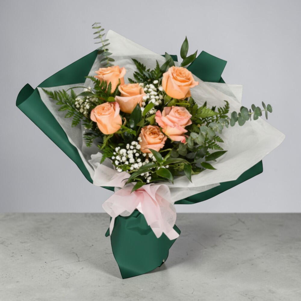 Bouquet de 6 roses couleur pêche avec des fleurs d'accompagnement dans un bel emballage. Magnifique bouquet de 6 roses couleur pêche avec de délicates fleurs d'accompagnement, élégamment enveloppé dans un papier de qualité pour un aspect doux et charmant. Ce bouquet de roses couleur pêche est parfait pour exprimer gratitude, admiration et vœux chaleureux. Des roses fraîches cueillies à la main offrent des tons délicats et une beauté durable. Conseil d'entretien : Coupez les tiges en biais, placez-les dans de l'eau propre et tenez-les à l'écart de la lumière directe du soleil. Changez l'eau tous les 2 jours pour maintenir la fraîcheur et prolonger la durée de vie en vase.