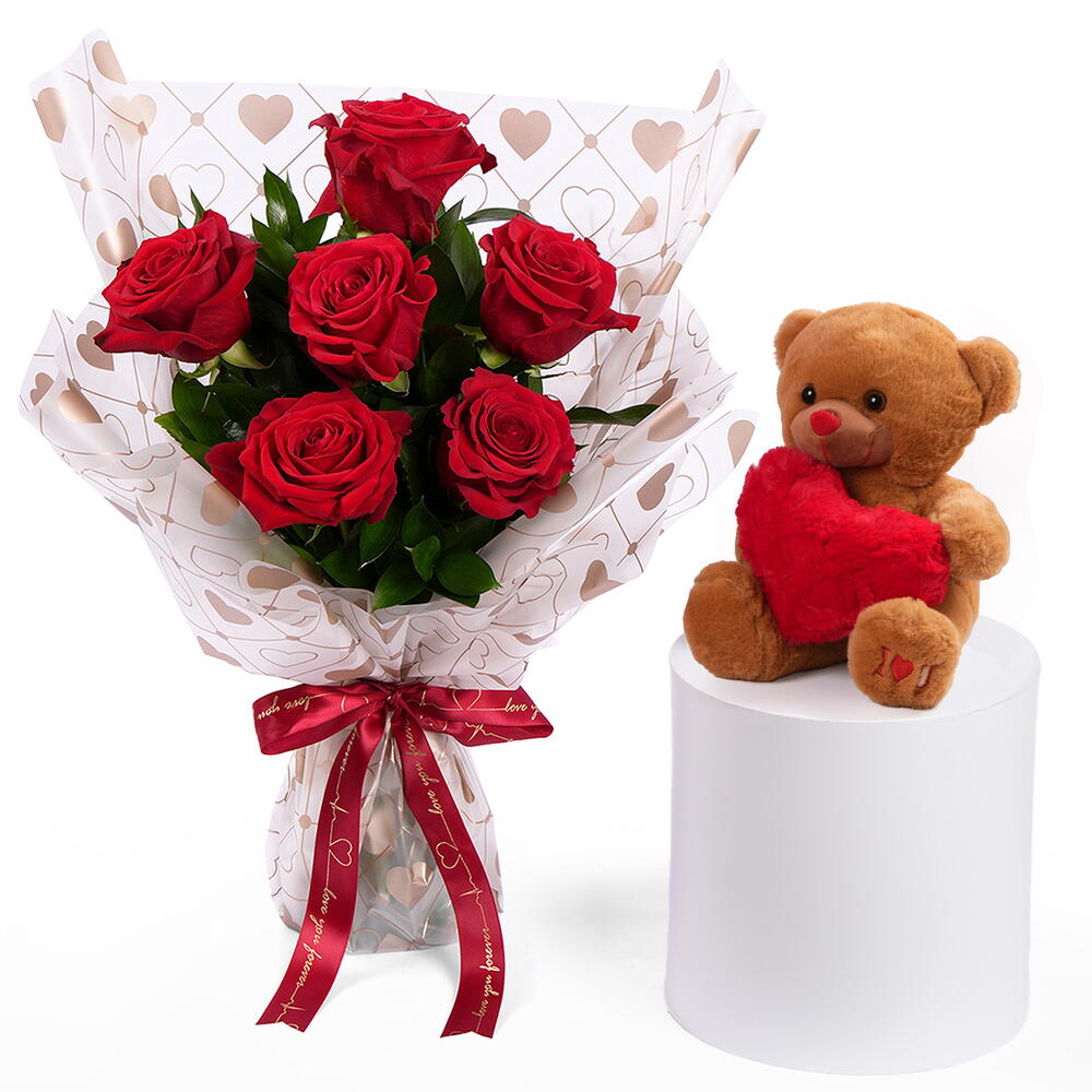 Exprimez votre amour avec l'élégance intemporelle de notre bouquet de 5 roses rouges accompagné d'un ourson marron. Chaque rose est sélectionnée à la main pour ses pétales riches et veloutés et sa teinte cramoisie profonde, symbolisant la passion, la romance et une affection sincère. Parfaitement arrangé et emballé avec soin, ce bouquet constitue un magnifique cadeau pour votre personne chère à la Saint‑Valentin. Qu'il s'agisse d'un premier rendez‑vous, d'un anniversaire ou simplement pour dire « je t'aime », ces roses parlent sans effort le langage de l'amour. Points forts : - 5 roses rouges fraîches avec un ourson marron - Emballage élégant avec un ruban - Livré à la main, avec amour et soin - Idéal pour la Saint‑Valentin, les anniversaires ou les gestes romantiques Faites de cette Saint‑Valentin un moment inoubliable, laissez votre amour s'épanouir grâce à la simplicité et à la beauté de cinq roses parfaites.