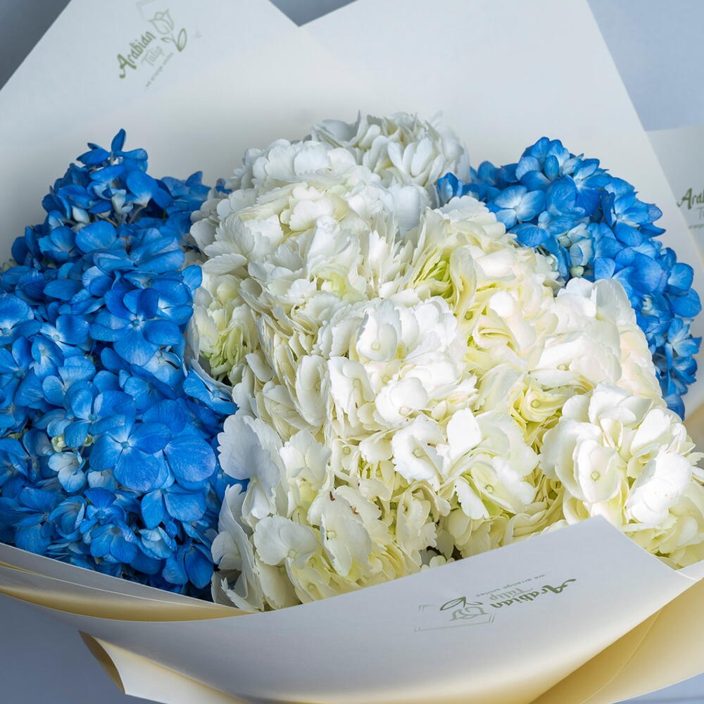 Bouquet de 7 hortensias mélangés, emballés dans du papier naturel et noués avec un ruban. Toutes les fleurs seront très fraîches, en bouton ou semi-floraison. Elles seront pleinement épanouies plus tard, si vous les laissez dans l'eau. Changez l'eau tous les jours et coupez légèrement le pied tous les deux jours.