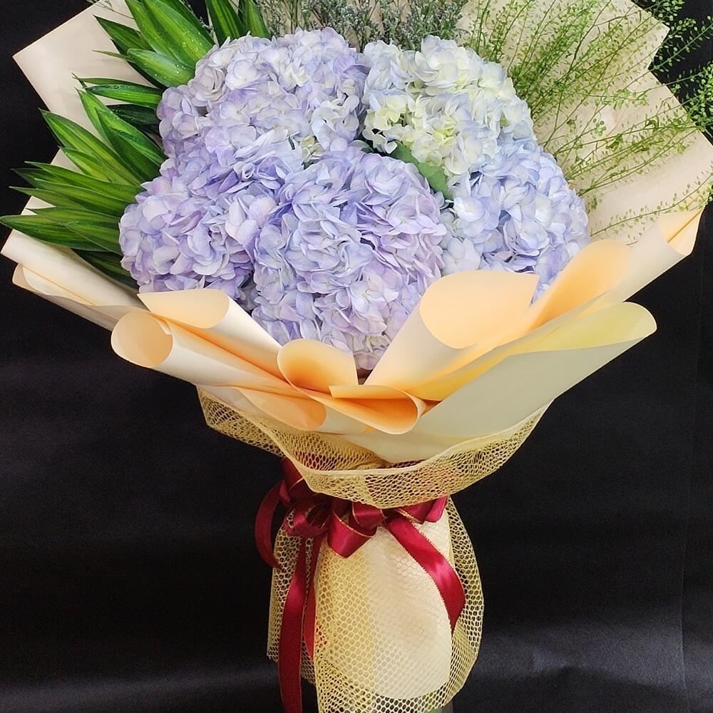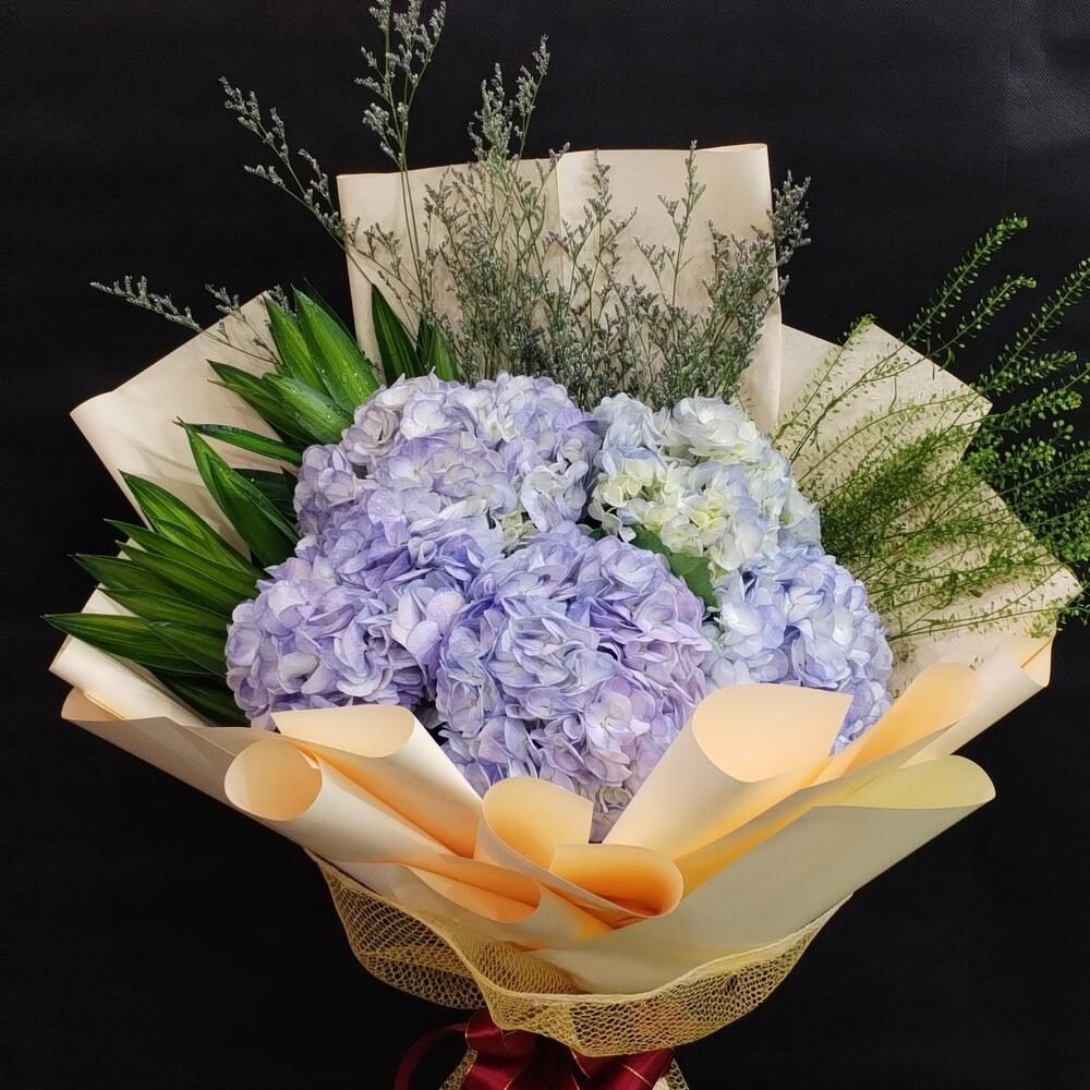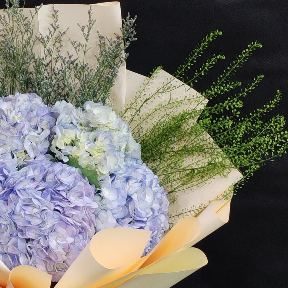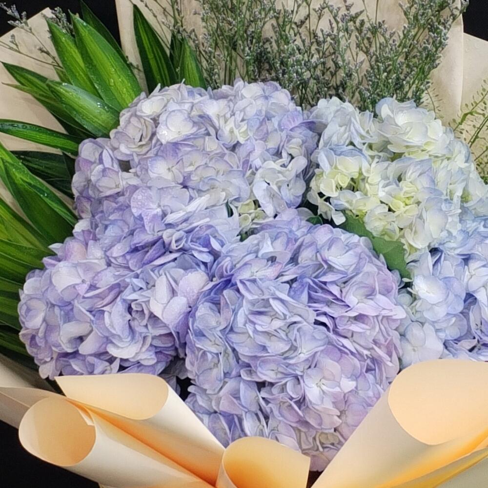 Ribbon - 1 pce Hydrangea - 5 pce Limonium - 3 pce Wrapping - 5 pce Leaves - 5 pce