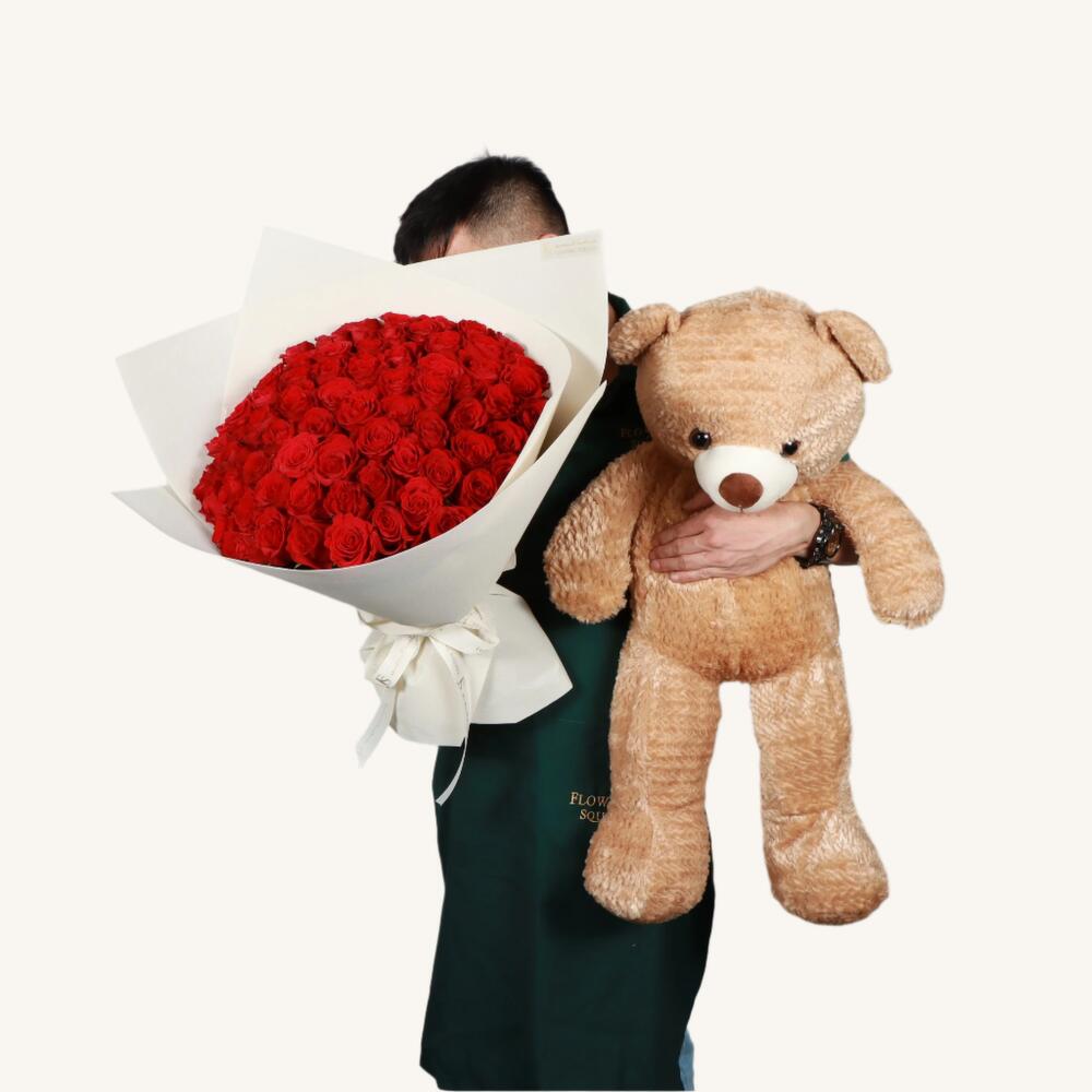 - 70 roses rouges et ours en peluche - Hauteur du bouquet: 60 cm Largeur: 40 cm - Hauteur de l'ours en peluche: 75 cm Largeur: 35 cm