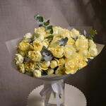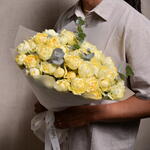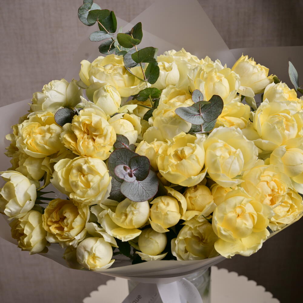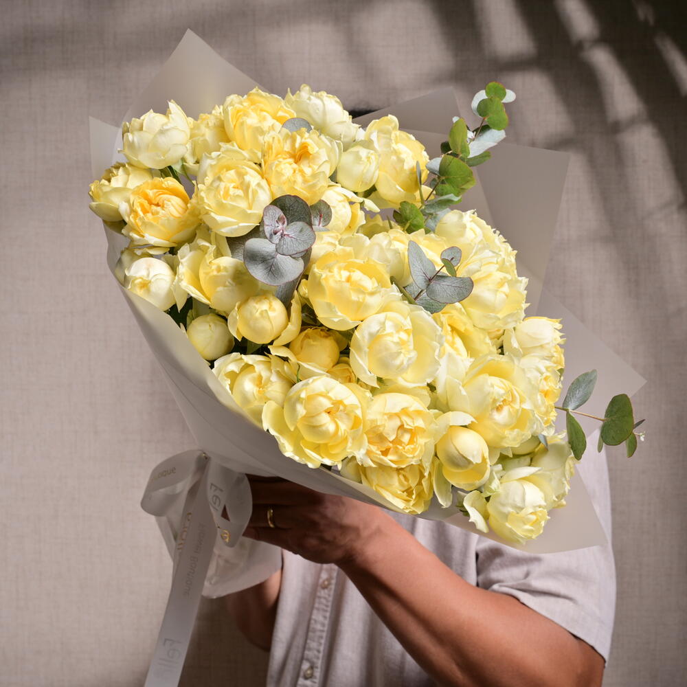 Le bouquet 9 Julieta Limoncella avec eucalyptus présente 9 exquises roses Julieta Limoncella d'une teinte jaune douce et rafraîchissante, complétées par des rameaux d'eucalyptus élégants. Cette combinaison crée un bouquet serein et sophistiqué, parfait pour toute occasion spéciale ou pour égayer n'importe quel espace par sa douce beauté.