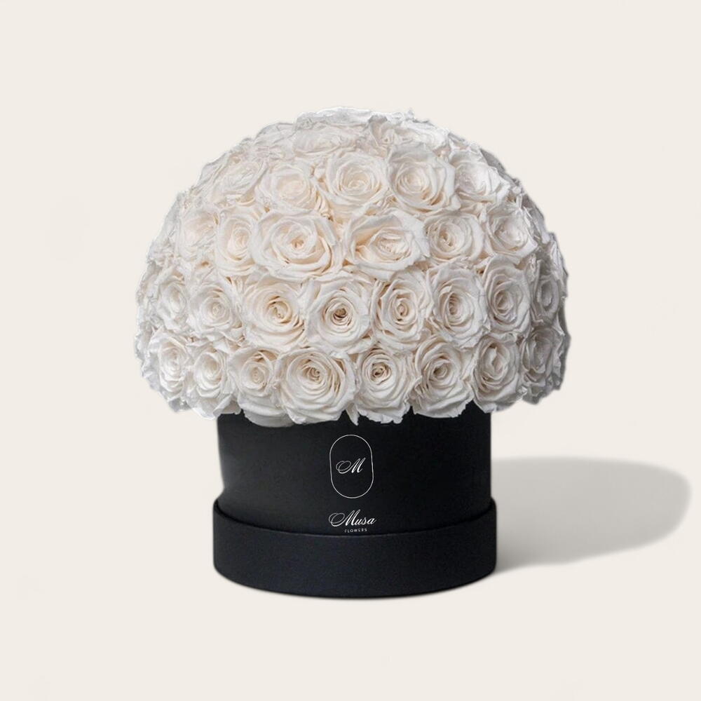 Arrangement élégant de 99 roses blanches en boîte à chapeau
