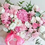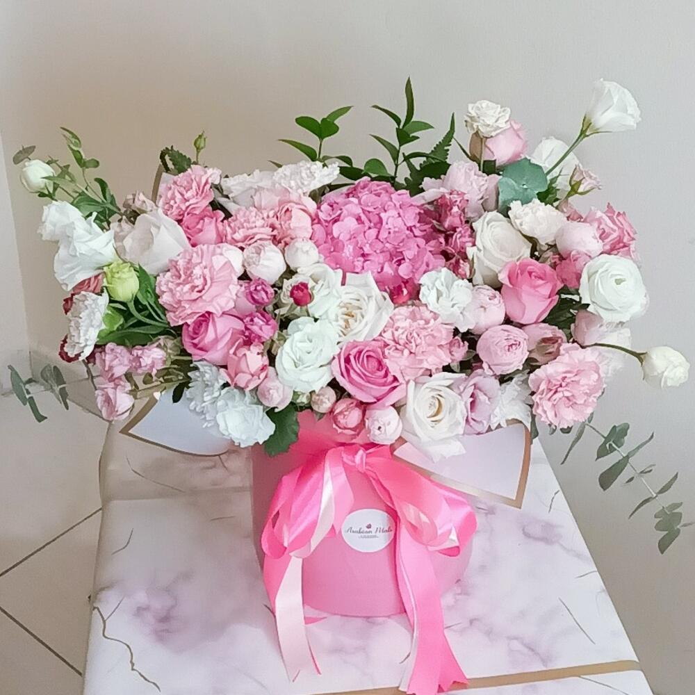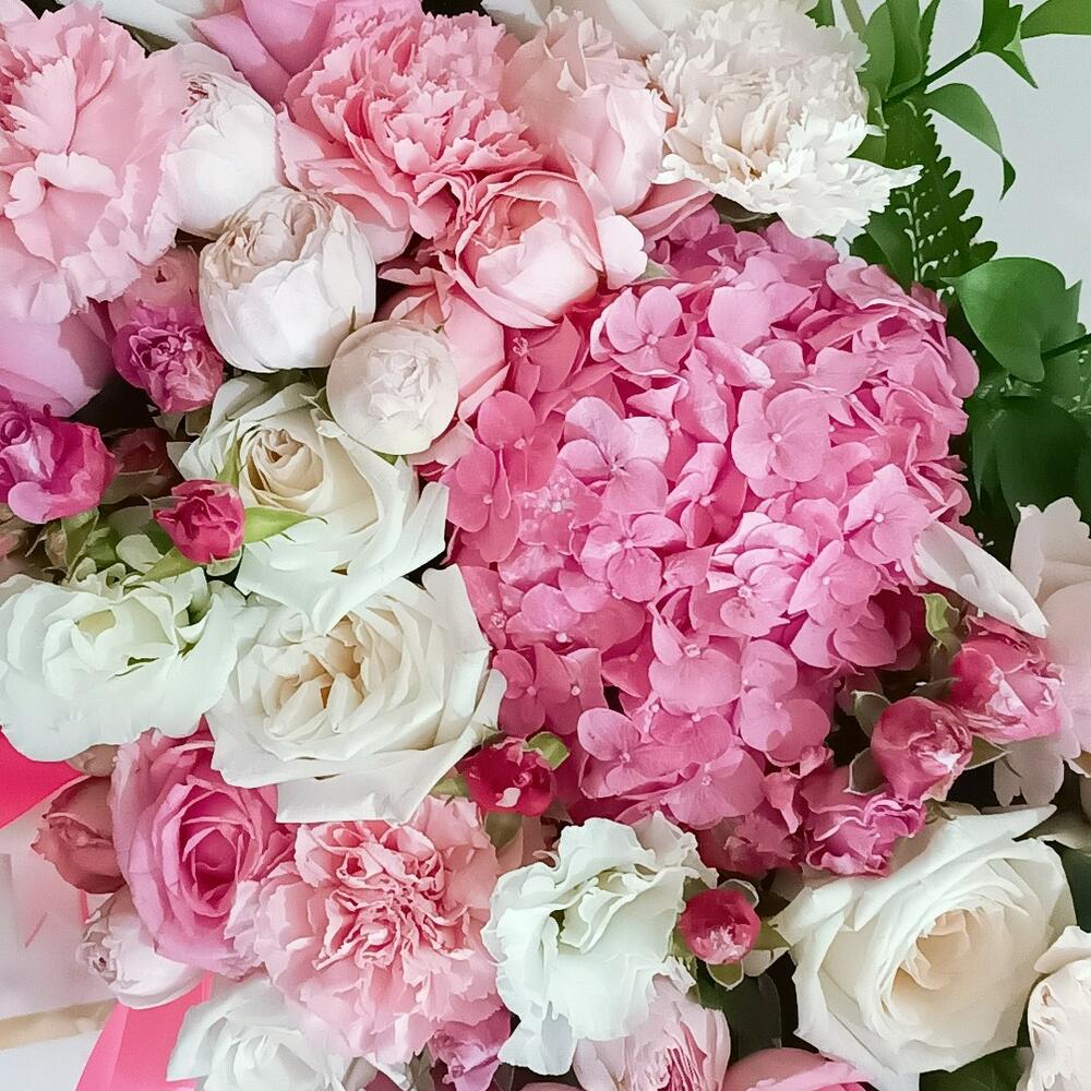 Spray rose - 6 pce Pink rose - 6 pce White rose - 5 pce Lisianthus - 4 pce carnation - 7 pce pink hydrangea - 1 pce ohara rose - 4 pce rose en spray de type pivoine - 5 pce