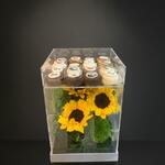 BOÎTE ACRYLIQUE AVEC TOURNESOLS ET CHOCOLATS (16 PIÈCES)
