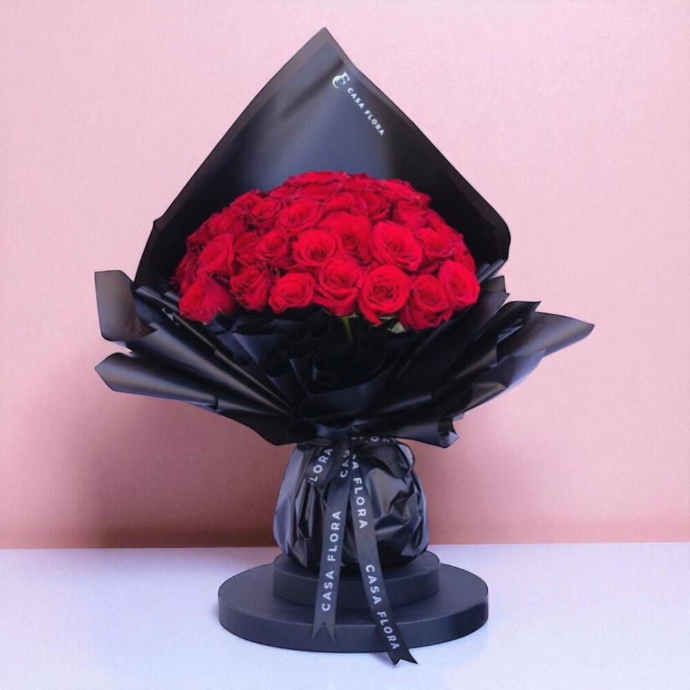 Vivez l'expression ultime de l'élégance et de la passion avec ce superbe bouquet de roses rouges luxuriantes, enveloppé d'un noir épuré et luxueux. Chaque rose est soigneusement sélectionnée pour son épanouissement parfait et sa couleur cramoisie intense, symbolisant un amour profond et la dévotion. Le contraste dramatique entre les pétales veloutés et l'emballage noir brillant crée une esthétique moderne et frappante. Fini avec le ruban signature de Casa Flora, cet arrangement rayonne de sophistication et d'exclusivité. Parfait pour les célébrations romantiques, les étapes marquantes ou simplement pour faire une déclaration audacieuse, il capture l'essence du romantisme intemporel avec une touche contemporaine. Ce bouquet n'est pas seulement des fleurs — c'est une déclaration d'amour sous sa forme la plus captivante.