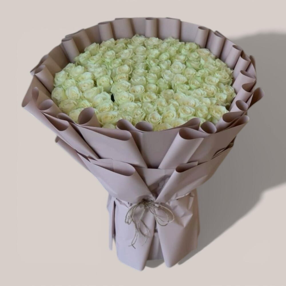 A massive, circular arrangement of pristine white roses, meticulously organized for a clean and luxurious aesthetic, enveloped in structured, dusty-rose paper.