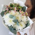 Un bouquet d'alstroemères, d'eucalyptus et de chrysanthèmes est une combinaison de sophistication et de fraîcheur. L'alstroemère est une fleur vive et délicate qui ajoutera une touche de romantisme à votre bouquet. L'eucalyptus est un symbole de fraîcheur et de pureté et donnera à votre bouquet un parfum unique. Le chrysanthème est une fleur classique qui sera toujours d'actualité. Le bouquet est composé de couleurs claires, ce qui le rend léger et aérien. Un tel bouquet sera un merveilleux cadeau pour toute célébration ou simplement une agréable surprise pour un être cher.