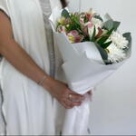 Chrysanthemum - 2 pce Alstroemeria - 3 pce ribbon satin - 1 pce emballage design - 1 pce