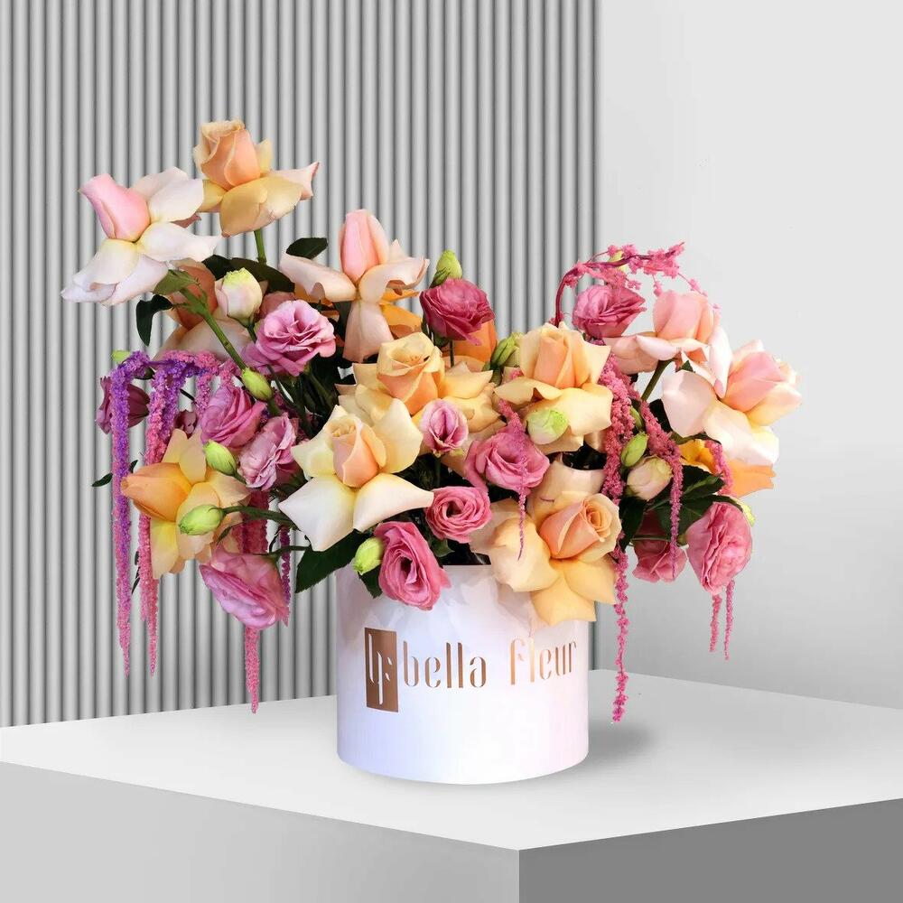 Boîte Bella moyenne de fleurs mélangées rose et pêche