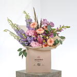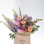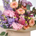 A graceful bouquet of lavender delphiniums, pink hydrangeas, Gerbera Pasta, soft astilbe, pink lisianthus, deep purple Ecuadorian roses, and purple snapdragons—blending romantic hues with a delicate, garden-inspired elegance.