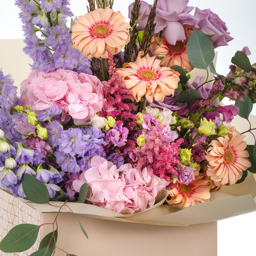 A graceful bouquet of lavender delphiniums, pink hydrangeas, Gerbera Pasta, soft astilbe, pink lisianthus, deep purple Ecuadorian roses, and purple snapdragons—blending romantic hues with a delicate, garden-inspired elegance.
