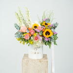 Solidago - 6 pce Sunflower - 3 pce hortensia blanc - 2 pce boîte blanche - 1 pce thlaspi - 1 pce statice rose - 4 pce delphinium blanc - 3 pce hermosa rose - 3 pce