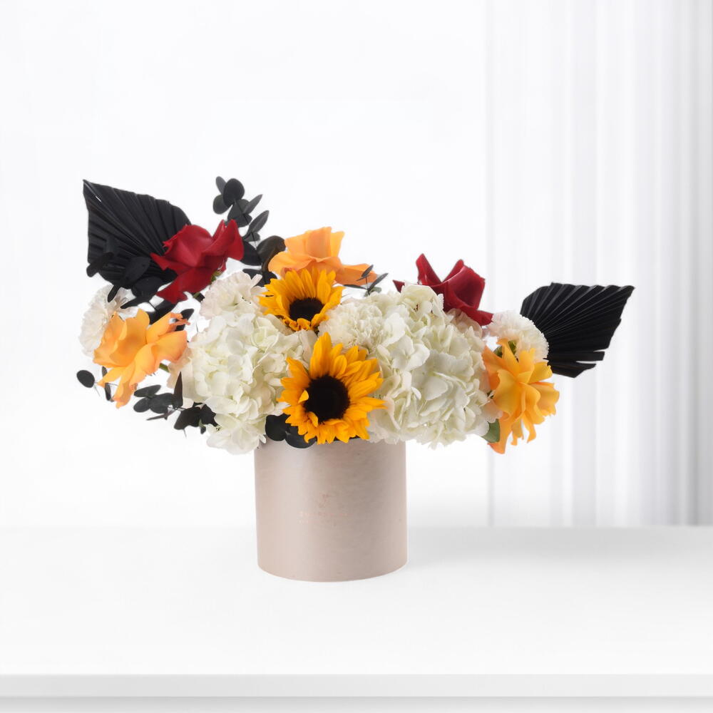 Découvrez un ravissant arrangement floral en boîte, un chef-d'œuvre vibrant de splendeur et de beauté. Composé de deux tournesols éclatants, dont les pétales jaune vif éveillent les sens, et de deux hortensias blancs opulents, dont les fleurs généreuses et luxuriantes ajoutent une touche d'élégance. Le spectacle se poursuit avec deux roses rouges passionnées et trois roses orange captivantes, dont les parfums inoubliables ajoutent une touche enivrante. L'ensemble est harmonieux grâce à quatre œillets blancs immaculés, qui amplifient sa grâce, et à des feuilles d'eucalyptus vert profond, élégamment disséminées, qui apportent une fraîcheur incomparable et une sensation de luxuriance. Cette composition florale à couper le souffle est le cadeau idéal pour vos proches. Découvrez le charme irrésistible des fleurs fraîches avec cet arrangement exquis.