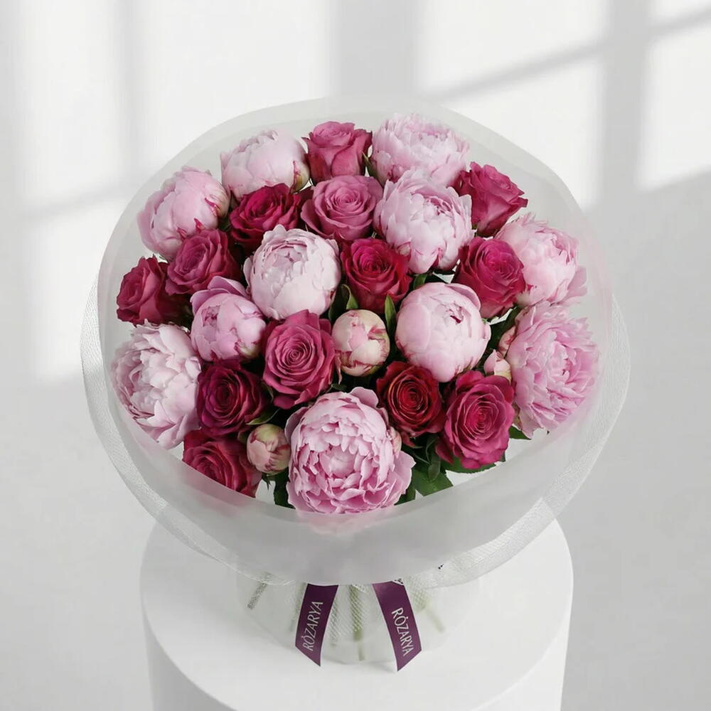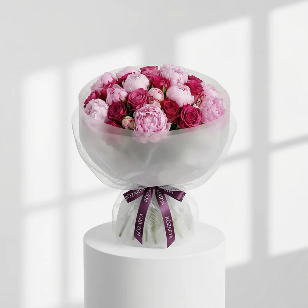 A romantic bouquet in rich and soft pink shades, arranged with lush peonies and elegant roses. Full, feminine, and luxurious, this bouquet is a beautiful choice for birthdays, Mother’s Day, Valentine’s Day, and special celebrations. • Please Note: As flowers are natural products, actual colors may vary slightly from digital images due to seasonal growth and lighting conditions. We guarantee that the overall style and premium quality as well as freshness of your arrangement will always be maintained.