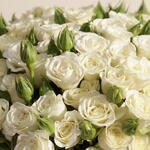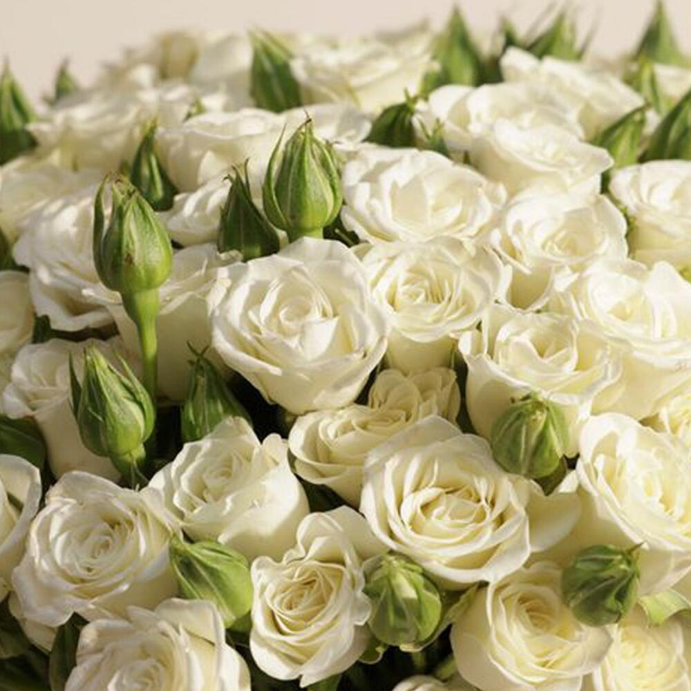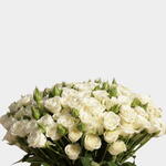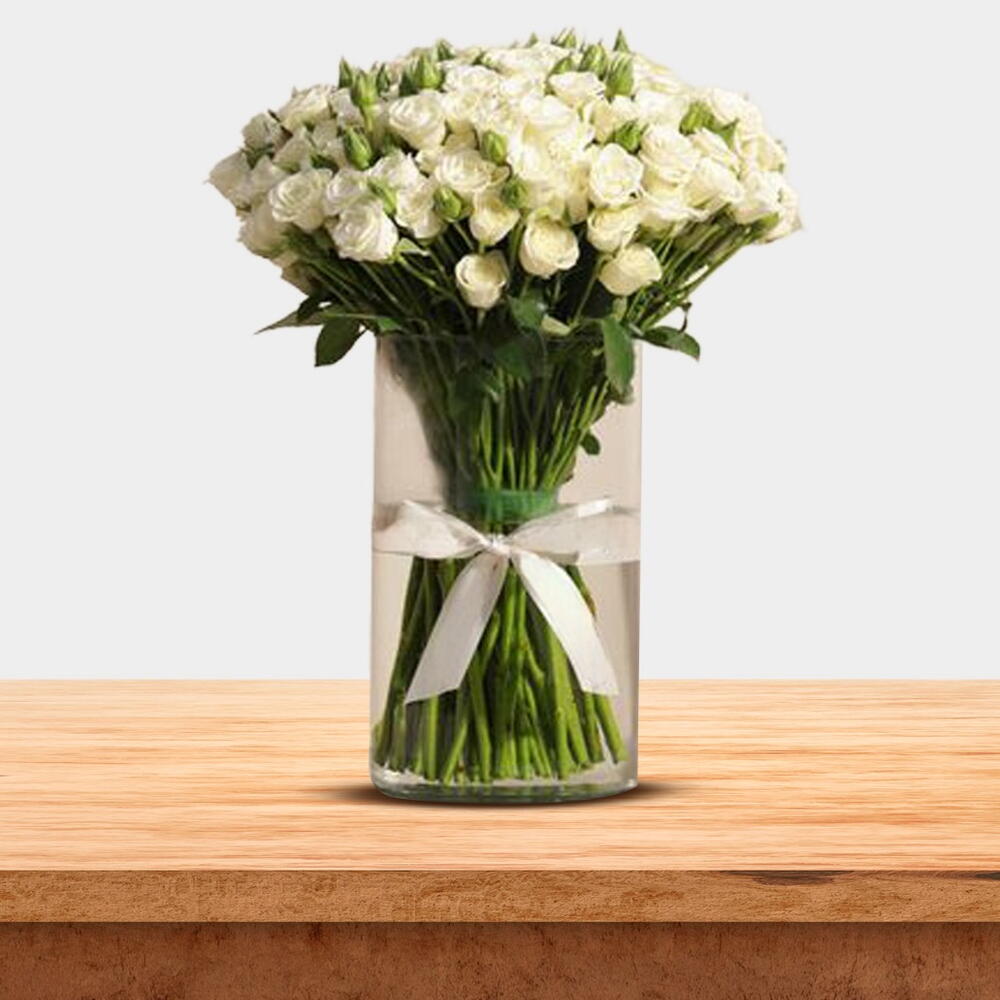 Un généreux bouquet de 50 mini-roses blanches présenté dans un vase transparent, une manière significative d'exprimer sa gratitude ou de célébrer avec élégance.