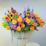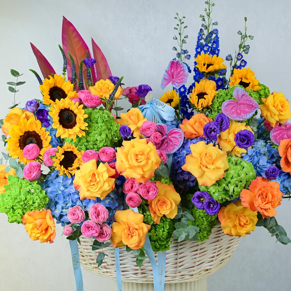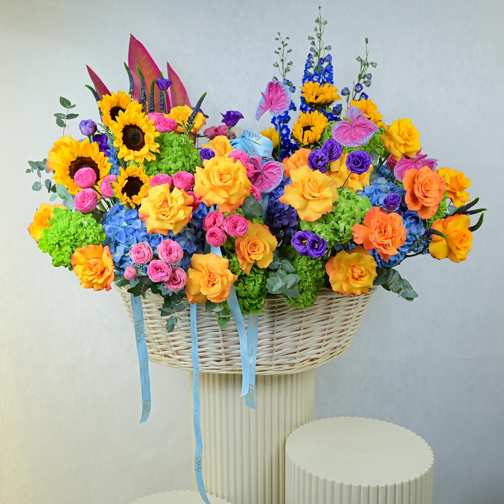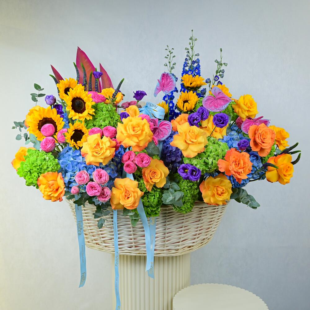 Apportez une touche d'élégance et de joie avec notre somptueux Angels Hamper, magnifiquement présenté dans un grand panier en bois. Cette collection exquise propose une abondante sélection de fleurs fraîches, ce qui la rend parfaite pour toutes les occasions ou comme cadeau attentionné pour une personne spéciale. Le panier comprend: 11 tournesols, 39 roses, 25 hortensias, 3 delphiniums, 3 feuilles de strelitzia, 20 roses Julieta, 15 eustomas, 15 véroniques, 5 anthuriums et 1 bouquet d'eucalyptus. Détails du produit: L'Angels Hamper est soigneusement arrangé dans un grand panier en bois, créant une présentation à couper le souffle, idéale pour les mariages, les anniversaires ou comme cadeau généreux pour égayer la journée de quelqu'un. Chez Fellora Flower Boutique, nous nous engageons à n'utiliser que des fleurs des plus fraîches afin de garantir que votre composition reste splendide et éclatante pendant plusieurs jours. Partagez la beauté et le charme de notre Angels Hamper avec une personne spéciale ou offrez-vous une délicieuse expérience florale !