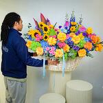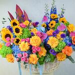 Véronique - 15 pce Ribbon - 2 pce Eustoma - 15 pce Eucalyptus - 1 pce Hydrangea - 25 pce Anthurium - 5 pce delphinium - 3 pce juliette - 20 pce tournesols - 11 pce wooden basket - 1 pce feuilles de strelitzia - 3 pce roses - 39 pce