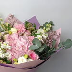 Gerbera - 3 pce hydrangea pink - 1 pce lisianthus white - 3 pce mathiola blanche - 3 pce eucalyptus - 3 pce alstroemeria pink - 3 pce mandala rose 5 - 5 pce lemoniuma rose - 5 pce