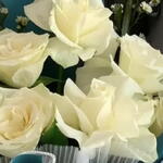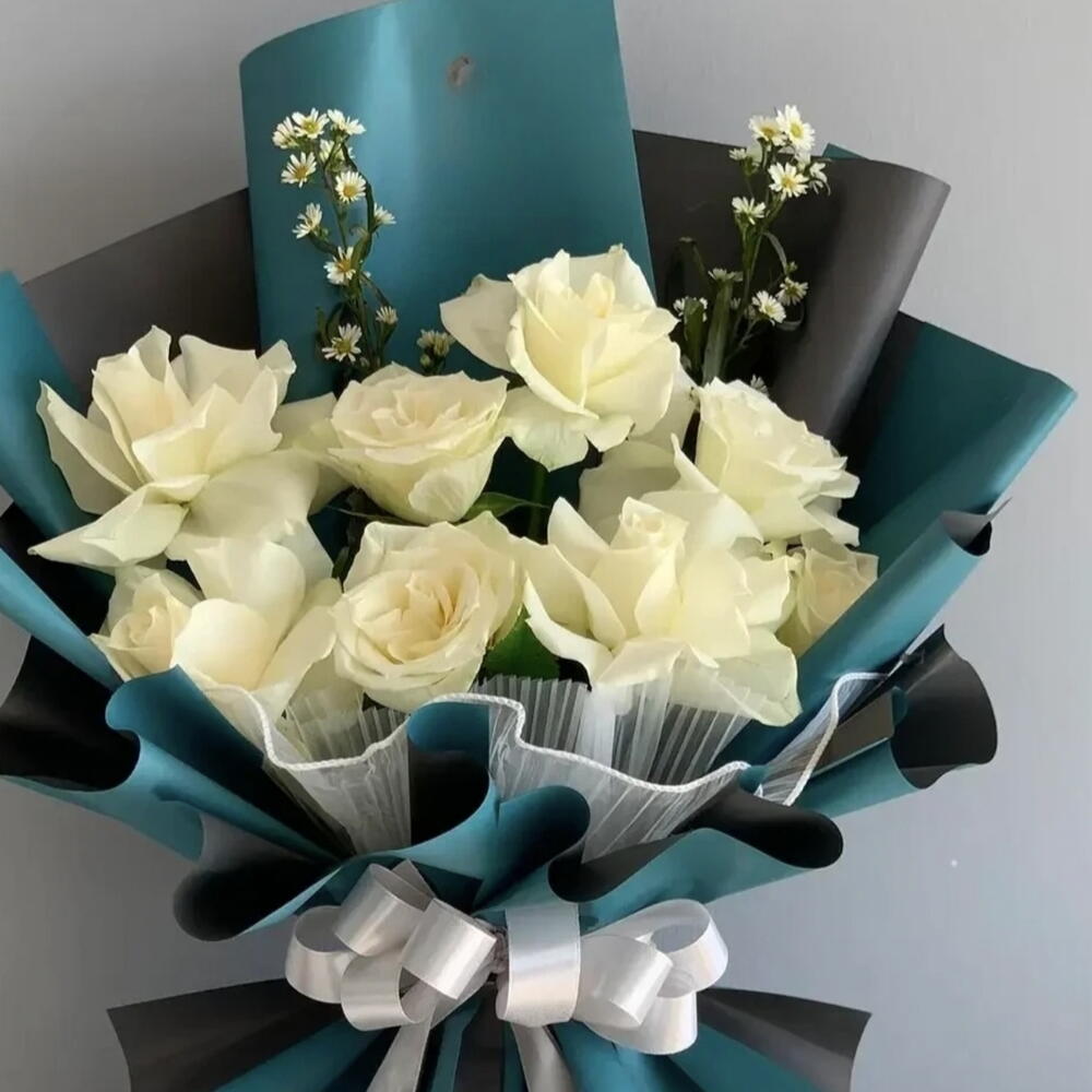 C'est un bouquet de fleurs blanches, composé principalement de roses blanches et de petites fleurs d'accompagnement blanches. Le bouquet est enveloppé dans un papier mêlant le bleu sarcelle et le noir, avec une couche plissée, blanche et translucide visible autour des fleurs. Un ruban en satin blanc est noué en un grand nœud autour du milieu du bouquet.