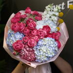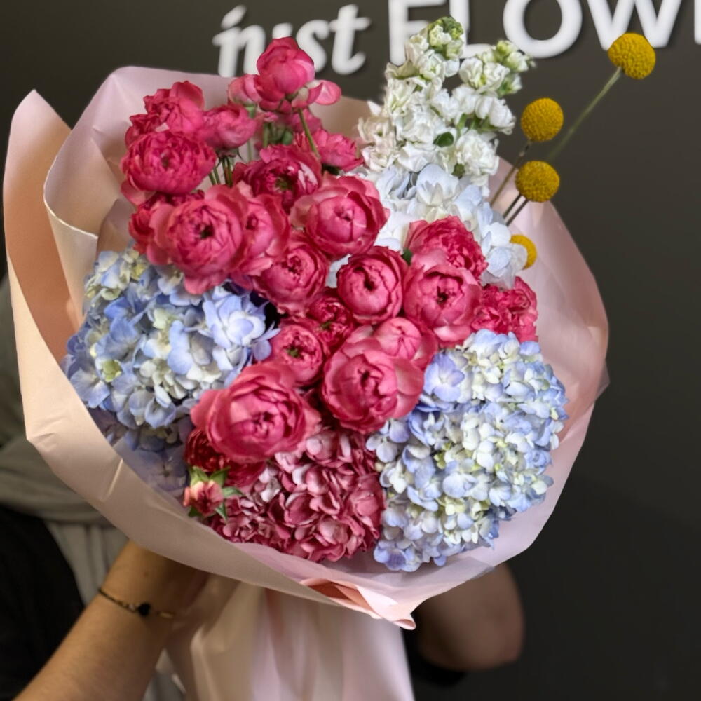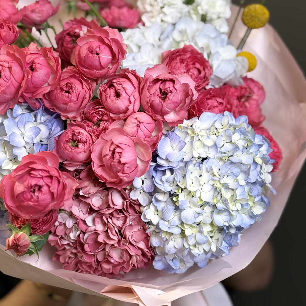 Un mélange captivant de renoncules roses et d'hortensias aux teintes rose poudré et bleu ciel. Le bouquet incarne charme et équilibre — un cadeau parfait pour célébrer l'amour, la joie, ou les nouveaux départs.