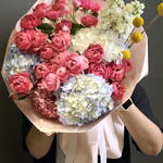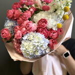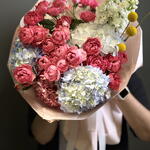 hortensias - 4 pce juliette cerise - 8 pce craspedia - 5 pce wrapping paper - 5 pce mattiola blanche - 4 pce
