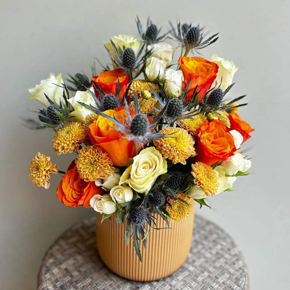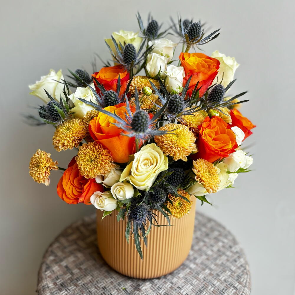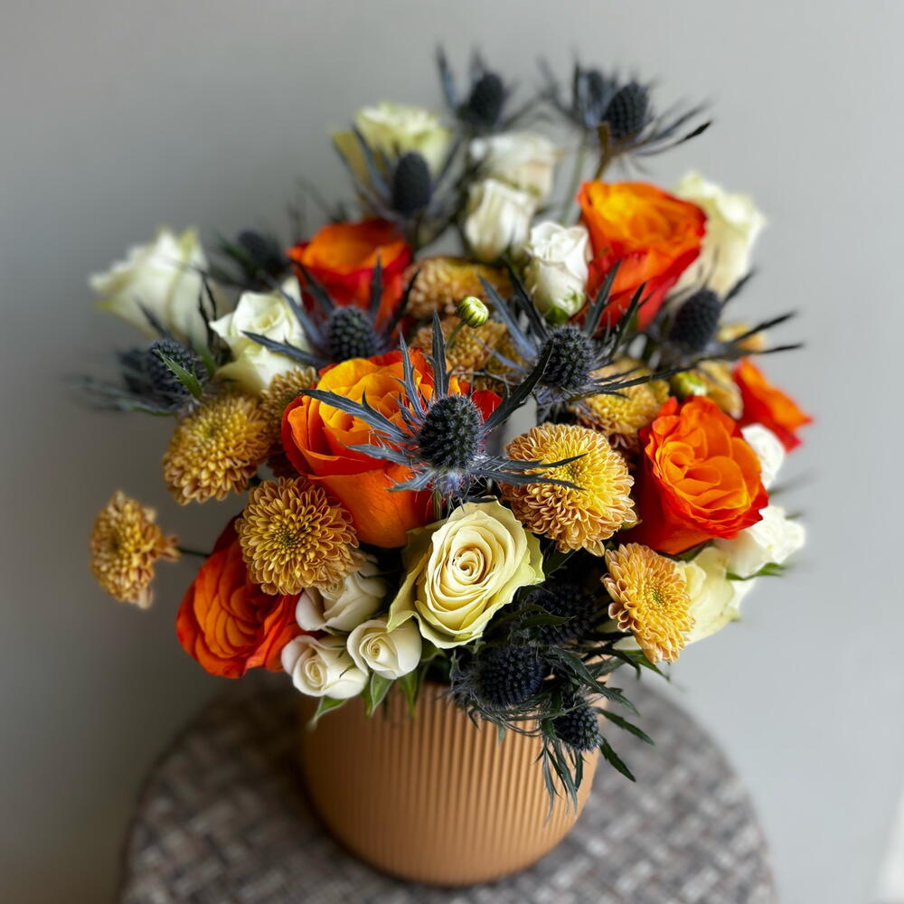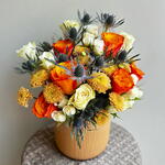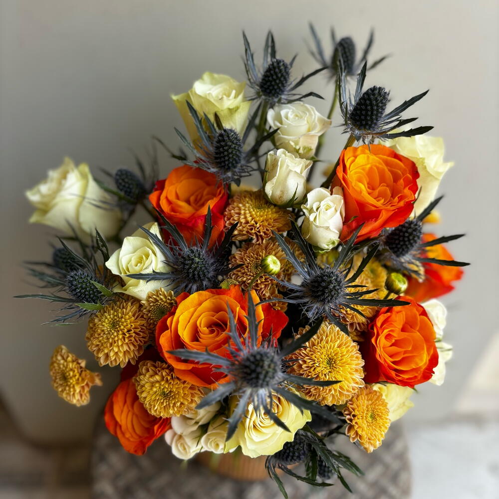 éryngium bleu - 4 pce roses spray blanches. - 5 pce roses orange - 7 pce roses blanches - 7 pce chrysanthèmes saumon - 5 pce