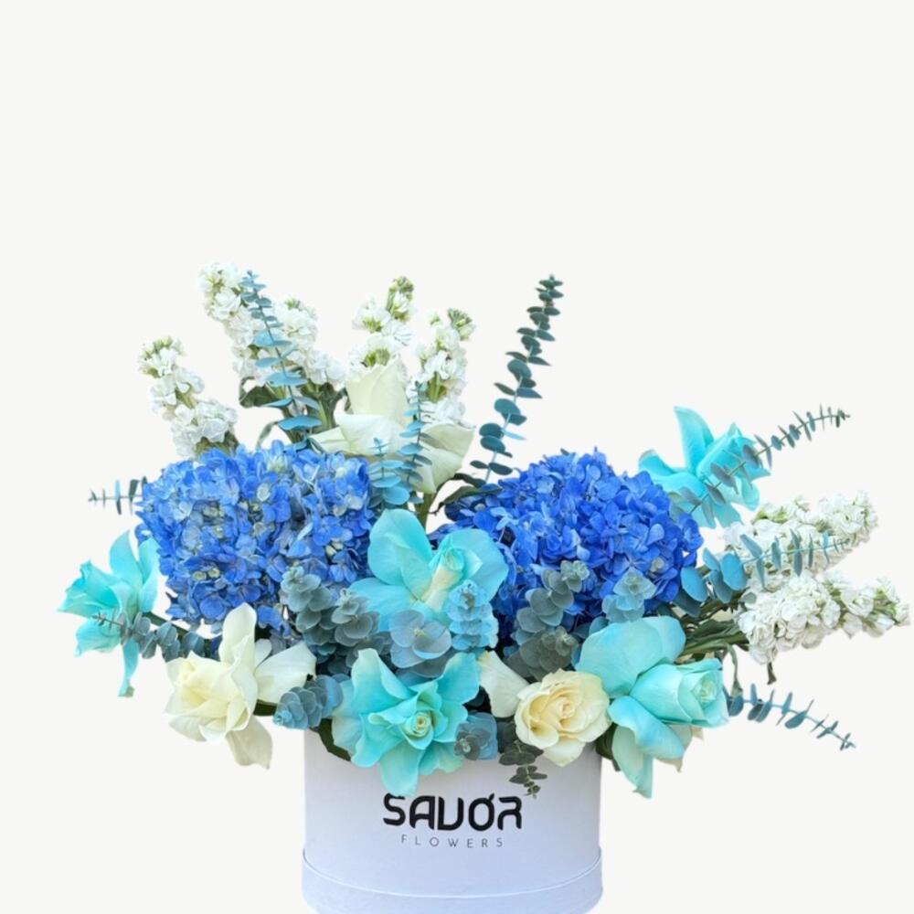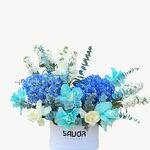hortensia bleu - 2 pce mathiola blanche - 8 pce roses - 8 pce eucalyptus - 6 pce