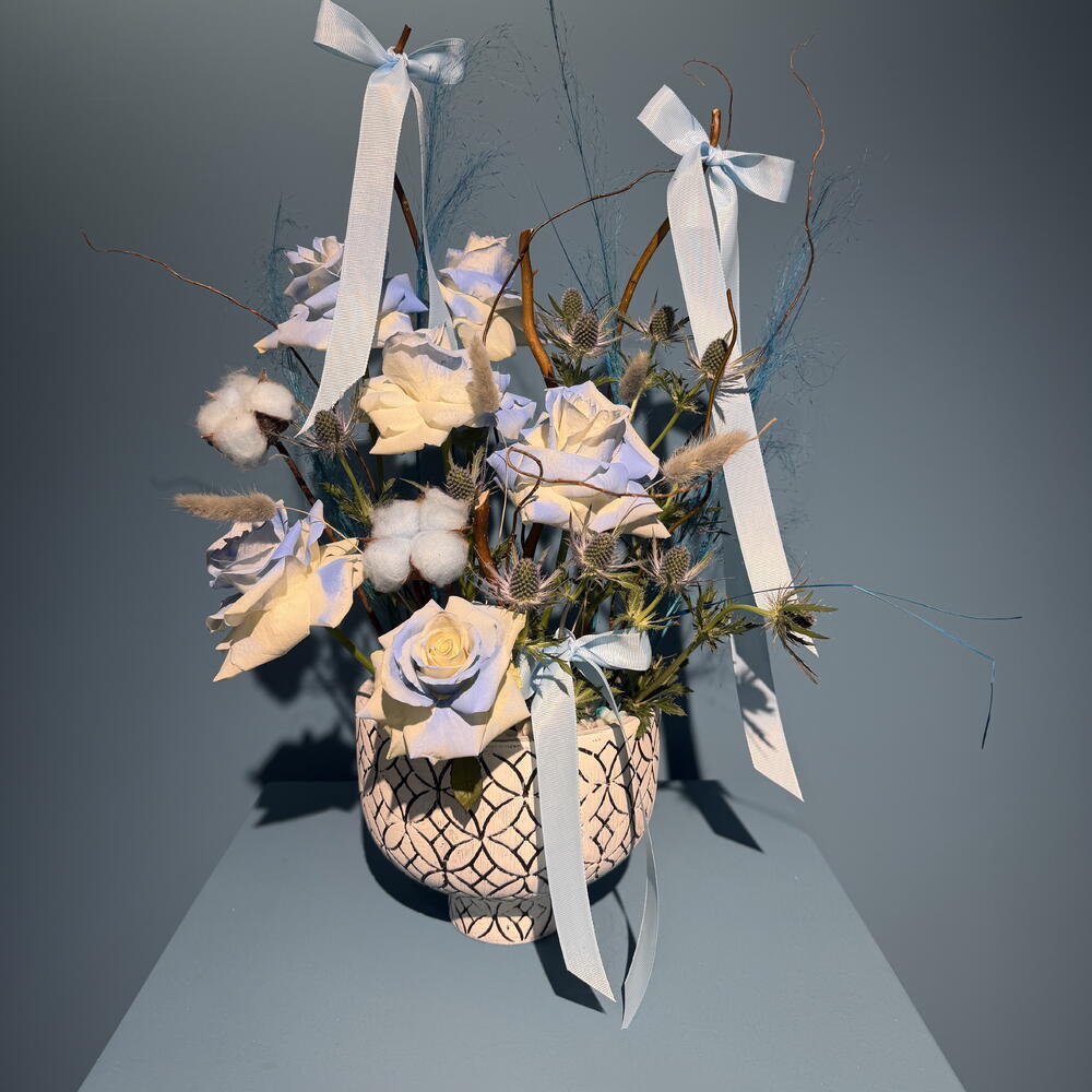 Un tendre arrangement floral inspiré par les tout premiers instants de joie. Des fleurs d'un blanc doux et d'un bleu pâle sont associées à des textures duveteuses, des rubans délicats et des accents sculpturaux pour créer une composition apaisante et réconfortante. Conçu pour célébrer la naissance d'un petit garçon, cet arrangement évoque la pureté, la délicatesse et la chaleur — comme ce tout premier sourire.