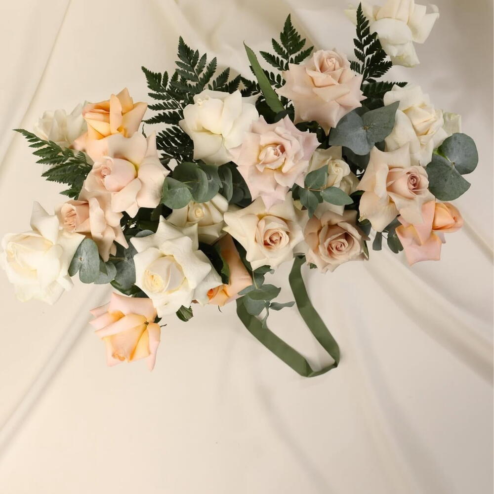 White rose - 10 pce orange rose - 5 pce eucalyptus leaves - 10 pce roses mauves - 5 pce