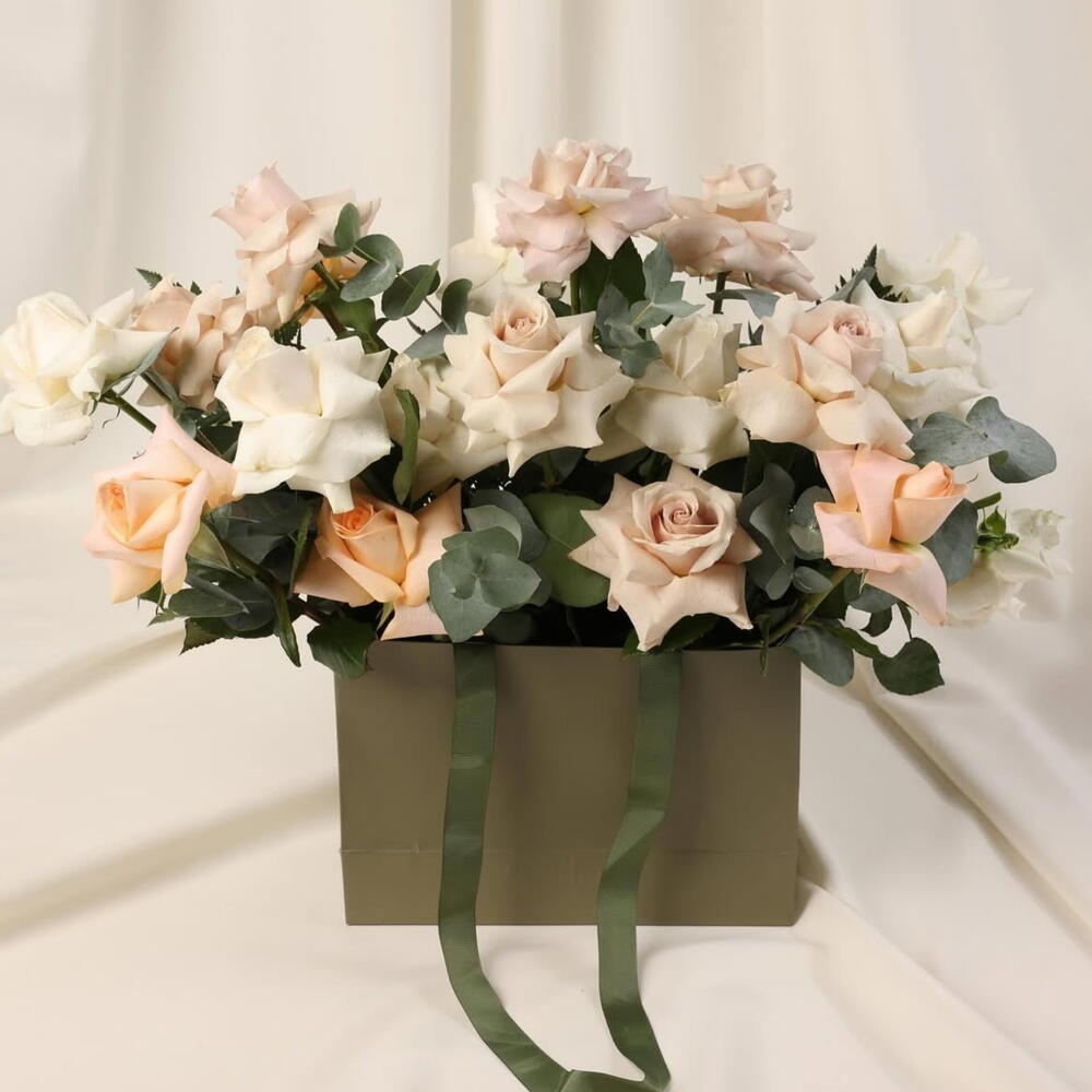 Bag of Happiness — Roses mélangées et eucalyptus dans un sac vert olive Bag of Happiness capture l'équilibre parfait entre gaieté, élégance et sophistication moderne. Composé de 5 roses mauves, 5 roses orange et 10 roses blanches immaculées rehaussées d'eucalyptus frais, chaque fleur est disposée dans un sac de luxe vert olive, créant un bouquet qui rayonne de charme coloré, de style raffiné et de joie contemporaine. Parfait pour votre petite amie, épouse, fiancée ou la femme qui apporte de la vie à chaque pièce, Bag of Happiness est idéal pour les anniversaires, les commémorations, les célébrations spéciales ou les surprises sincères « juste parce que ». Chaque fleur est sélectionnée à la main pour sa fraîcheur, ses teintes vibrantes et ses pétales impeccables, tandis que l'eucalyptus ajoute une verdure douce et une sophistication aromatique, faisant de cet arrangement une déclaration florale haut de gamme. Envoyez-le de la part d'un partenaire aimant, d'un mari dévoué ou d'un admirateur pour exprimer joie, admiration et luxe attentionné. Bag of Happiness est plus que des fleurs — c'est un cadeau poétique, digne d'Instagram, et une expérience florale digne d'être collectionnée, disponible pour une livraison le jour même à Dubaï et dans l'ensemble des Émirats arabes unis. ✨ Bag of Happiness — parce que la joie tient parfaitement dans un bouquet.