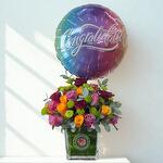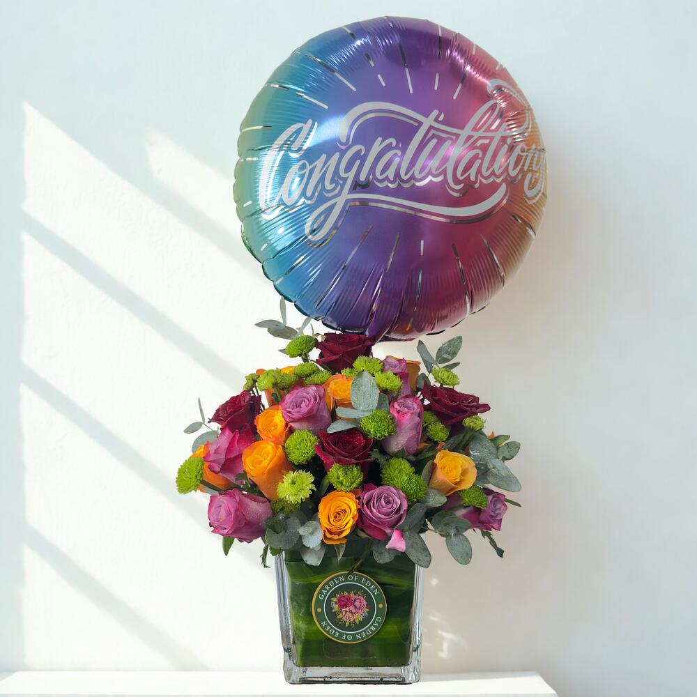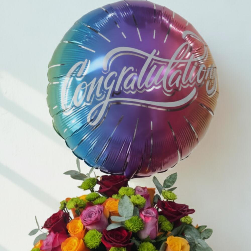 Célébrez les moments importants de la vie avec Cheers in Bloom, une composition lumineuse de félicitations alliant élégance et festivité. Composition dans un vase en verre composée de 21 roses de qualité supérieure : 5 rouges intenses, 7 violets enchanteurs et 9 orange vif. Rehaussée de délicates fleurs pour plus de texture et de charme. Associée à un joyeux ballon aluminium, elle est la célébration fleurie par excellence. Que ce soit pour une remise de diplôme, une promotion, un nouvel appartement ou toute autre occasion joyeuse, cette composition vibrante est synonyme de bonheur et de félicitations sincères. Envoyez une explosion de couleurs et de joie dès aujourd'hui ! Commandez Cheers in Bloom et rendez ce moment spécial inoubliable !
