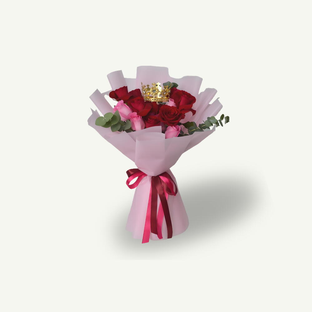 Bouquet noué à la main composé d'un mélange de 10 roses rouges et 5 roses roses, d'eucalyptus et d'un accessoire en forme de couronne, délicatement enveloppé dans un papier rose pâle pour une touche romantique et royale.